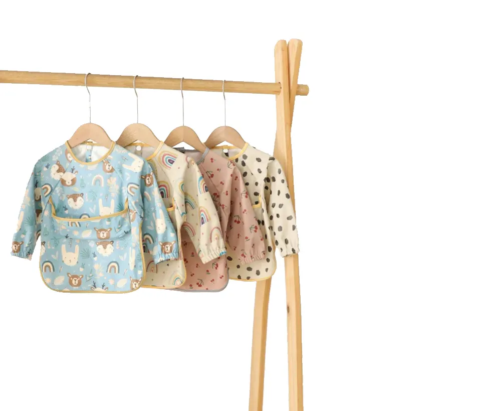 Bavetă impermeabilă pentru fetițe cu model animaluțe. Această bavetă cu mâneci nu va permite ca mâncarea să murdărească hăinuțele copilașului. Ușor de folosit și de spălat.