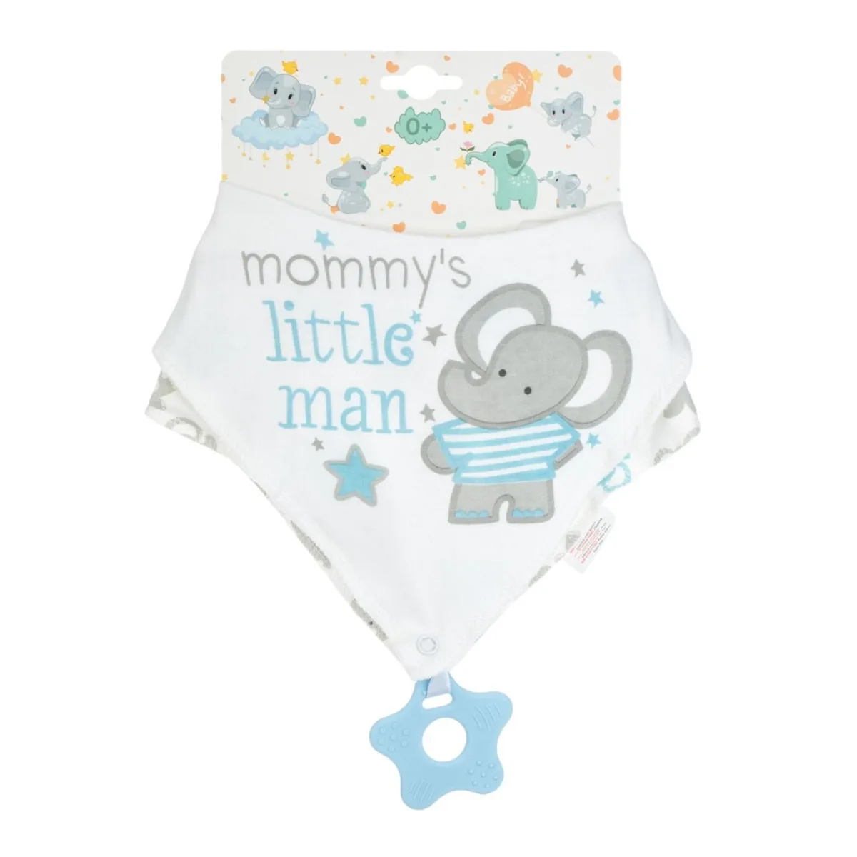 Protectie si Confort Acest set de bavete cu dentitie este creat special pentru a oferi confort si protectie bebelusului dumneavoastra in timpul meselor. Bavetele sunt realizate din 100% bumbac, un material moale si placut la atingere, care nu irita pielea sensibila a bebelusului. Ele sunt ideale pentru a proteja hainutele micutei de scurgeri si pete, asigurand in acelasi timp un aspect adorabil. Design Dragut cu Elefanti Bavetele sunt decorate cu un model simpatic de elefant si mesajul „Mommy's little man”, adaugand o nota emotionanta si personalizata. Designul este specific pentru baieti, in culori delicate si atractive. Setul include doua bavete, una dintre ele fiind echipata cu o jucarie de dentitie, perfecta pentru a calma gingiile sensibile ale bebelusului. Functionalitate Dubla: Baveta si Jucarie de Dentitie Unul dintre avantajele acestui set este functionalitatea dubla oferita. Baveta cu jucarie de dentitie este ideala pentru momentele in care micuta simte nevoia de a mesteca pentru a calma disconfortul cauzat de aparitia dintilor. Jucaria este usor de prins, oferind un plus de confort si practicabilitate. Specificatii Produs