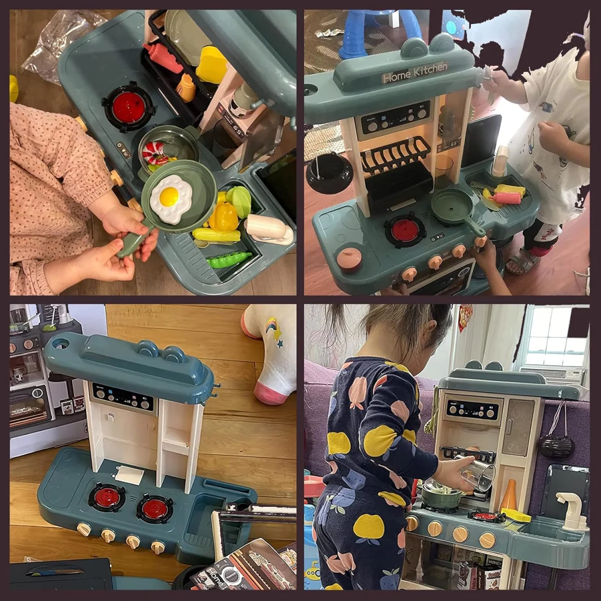 Aceasta bucatarie de jucarie este dotata cu 2 plite care lumineaza si produc sunete realiste de prajire si fierbere. Aducand un plus de autenticitate in jocul celor mici. Un alt detaliu impresionant este functia de abur a plitelor, care face ca experienta de gatit sa fie si mai captivanta. Bucataria include, de asemenea, o hota cu efecte sonore si luminoase, similare cu cele ale unei bucatarii reale.