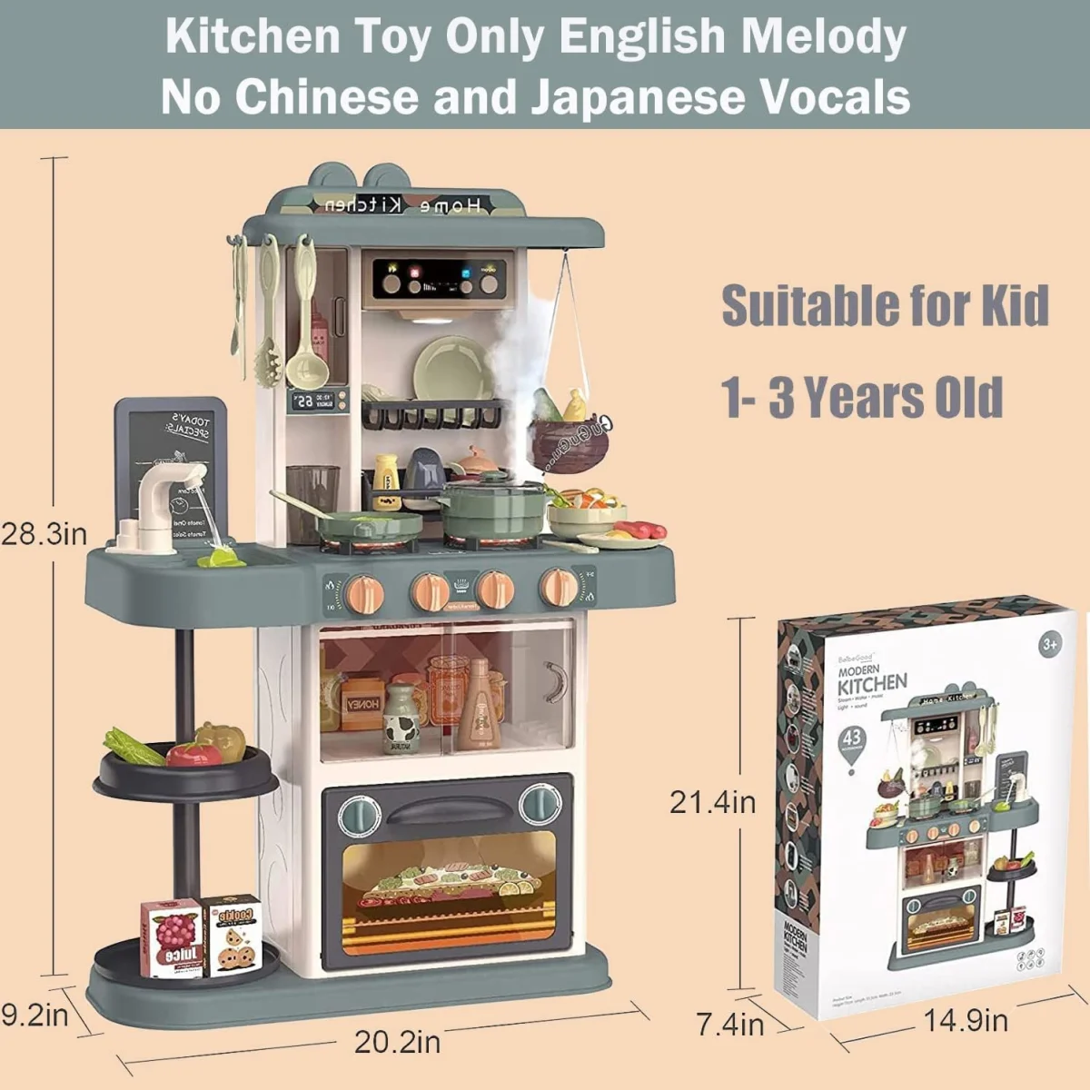 Setul include 43 de piese, printre care vesela, ustensile de bucatarie, produse alimentare de jucarie si o tablita pe care copiii pot scrie meniuri sau retete cu ajutorul cretei. In plus, bucataria este prevazuta cu diverse spatii de depozitare. Precum un cuptor, frigider si rafturi, incurajand copiii sa-si organizeze accesoriile si sa dezvolte obiceiuri de ordine si curatenie.
