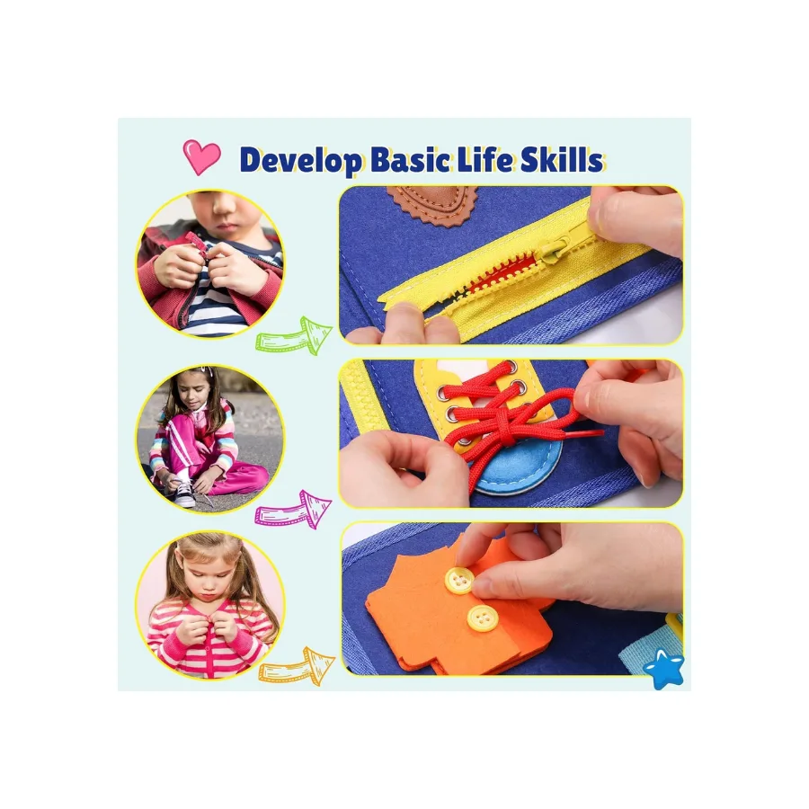 Aceasta Carte Activitati Monstessori este o jucarie educativa creata special pentru copiii intre 1 si 4 ani, care incurajeaza dezvoltarea abilitatilor cognitive, a motricitatii fine si a dexteritatii intr-un mod placut si sigur. Cu un design atractiv si culori vibrante, cartea include 8 pagini interactive cu diverse activitati Montessori: inchidere fermoar, legare sireturile, prindere nasturi, catarame reglabile si jocuri de potrivire a formelor, cifrelor, literelor sau culorilor.