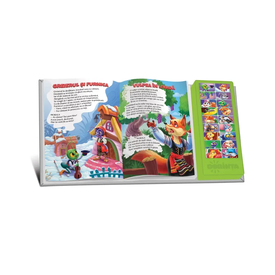 Cu o coperta buretata si dimensiuni generoase (30.5 x 30 cm), cartea este usor de manevrat si rezistenta in timp. Panoul lateral este dotat cu butoane sonore ilustrate care redau fragmente audio din fabule sau sunete sugestive ale personajelor, oferind astfel o experienta multisenzoriala ce imbina lectura cu ascultarea activa.