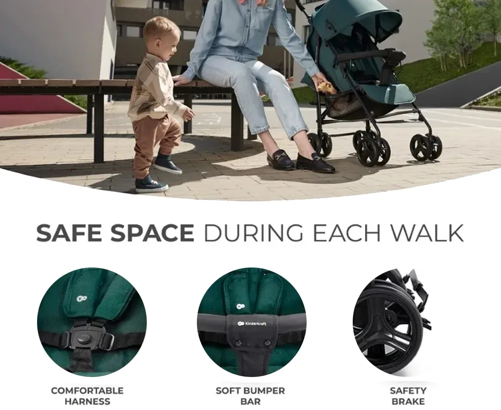 Umbrela TIK are curele reglabile in 5 puncte si o bara de siguranta completa si moale care creeaza un spatiu sigur in jurul sezutului. Puteti ajusta cu usurinta centurile la copilul in crestere, iar datorita protectiilor puteti fi sigur ca nu vor fi suparatoare pentru copil. In plus, TIK are doua frane pe rotile din spate - puteti folosi numai una din ele pentru a bloca in siguranta caruciorul.