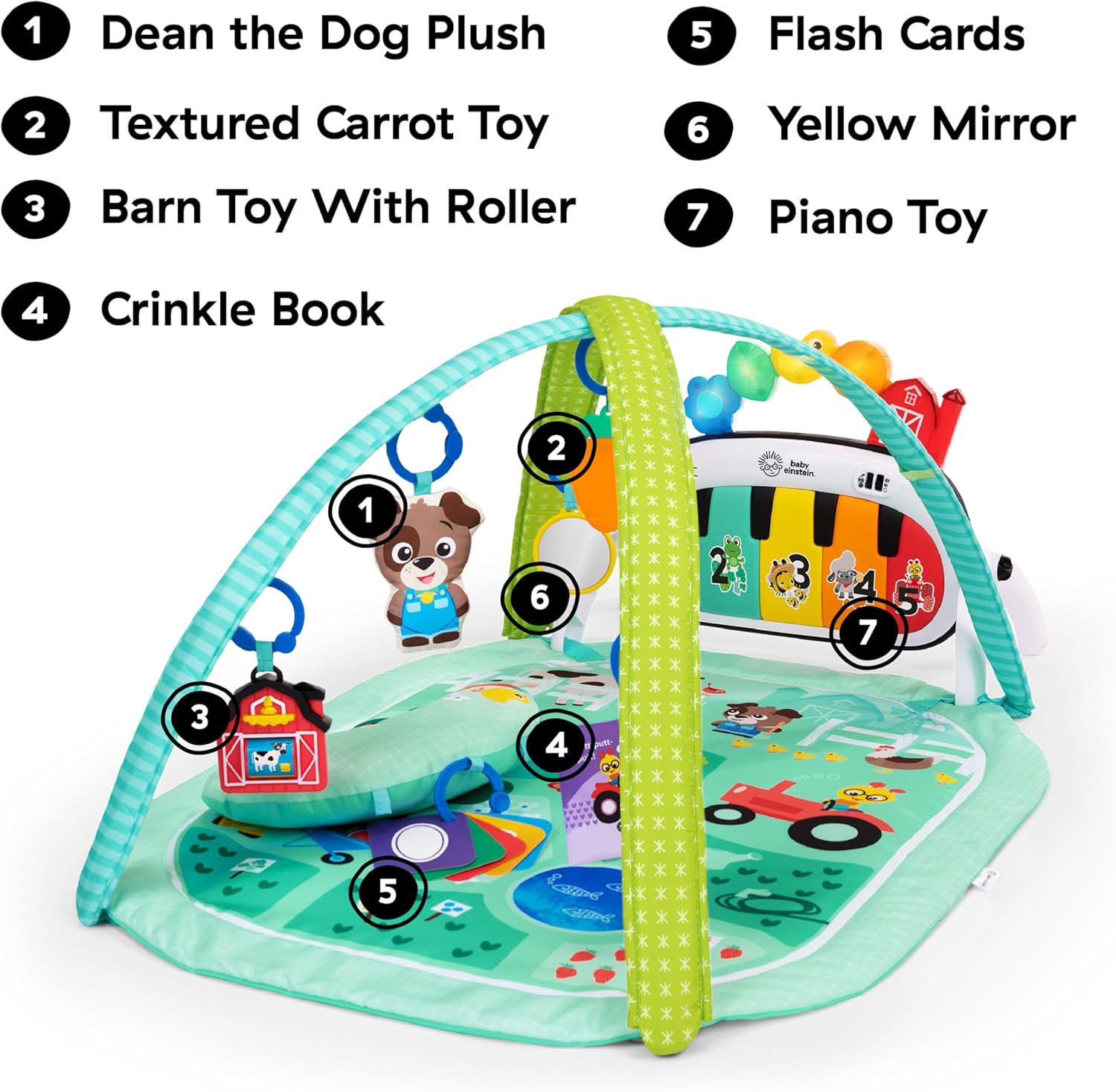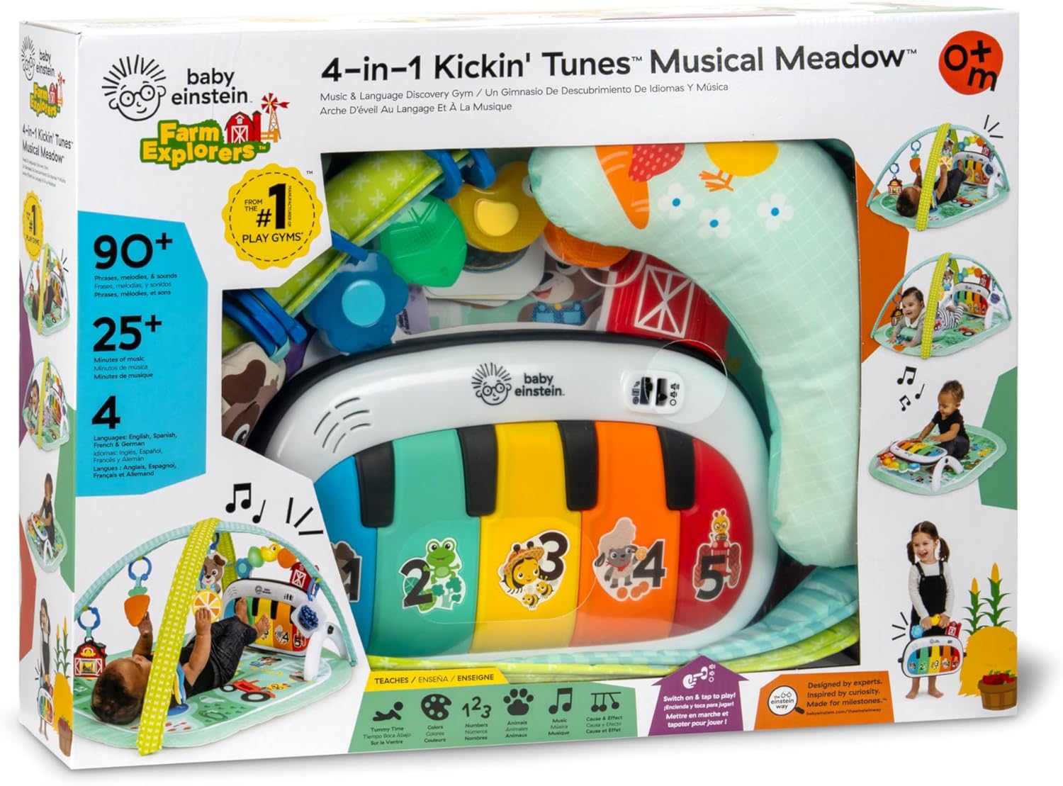Pachetul include 2 foi de activitati, 6 jucarii senzoriale detasabile, pernute de sprijin si pianul interactiv. Salteaua si jucariile se curata usor prin stergere. Produsul necesita 3 baterii AA, care nu sunt incluse. Centru de joaca Baby Einstein Farm Explorers 4 in 1 este o alegere inspirata pentru stimularea dezvoltarii bebelusului prin joaca, muzica si descoperire.