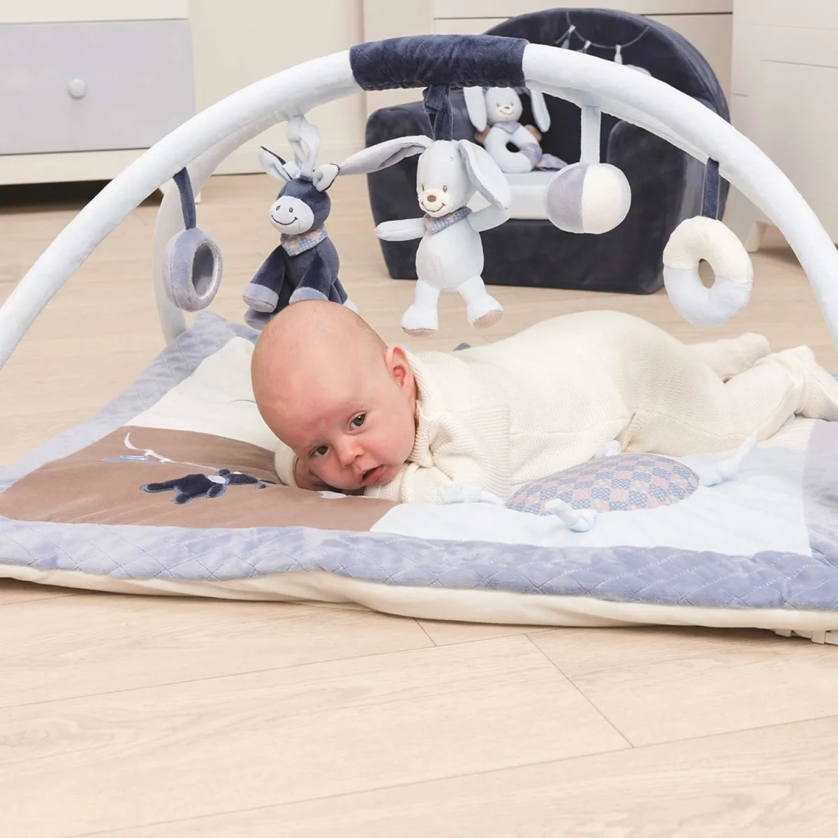 Covorul este prevazut cu un arc de jucarii colorate si amuzante, suspendate la o inaltime potrivita pentru ca bebelusul sa le atinga. Acestea stimuleaza curiozitatea, coordonarea mana-ochi si reflexele motorii. Copilul este incurajat sa exploreze, sa se miste si sa descopere texturi si forme noi intr-un mod sigur si placut.