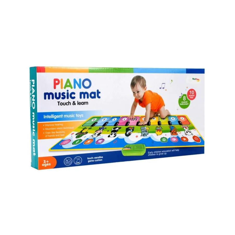 Covor interactiv cu pian ofera o experienta multisenzoriala pentru bebelusi si copii mici. Suprafata sa este decorata cu imagini viu colorate care activeaza diverse sunete muzicale. Include: