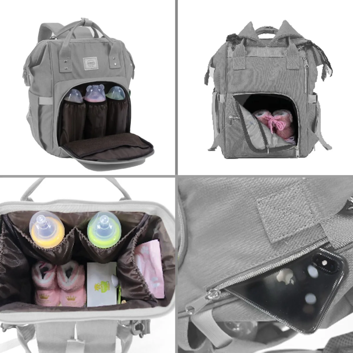 Geanta este dotata cu multiple compartimente care ajuta la organizarea eficienta a tuturor lucrurilor esentiale pentru bebelus. Interiorul include 2 buzunare cu fermoar si 4 compartimente elastice, ideale pentru depozitarea scutecelor, hainutelor sau jucariilor mici. Compartimentul exterior frontal este echipat cu 3 suporturi izoterme pentru biberon, mentinand astfel temperatura laptelui sau a altor bauturi. De asemenea, buzunarul cu plasa si cele 2 buzunare exterioare laterale ofera spatiu suplimentar pentru sticle de apa, servetele sau alte accesorii.