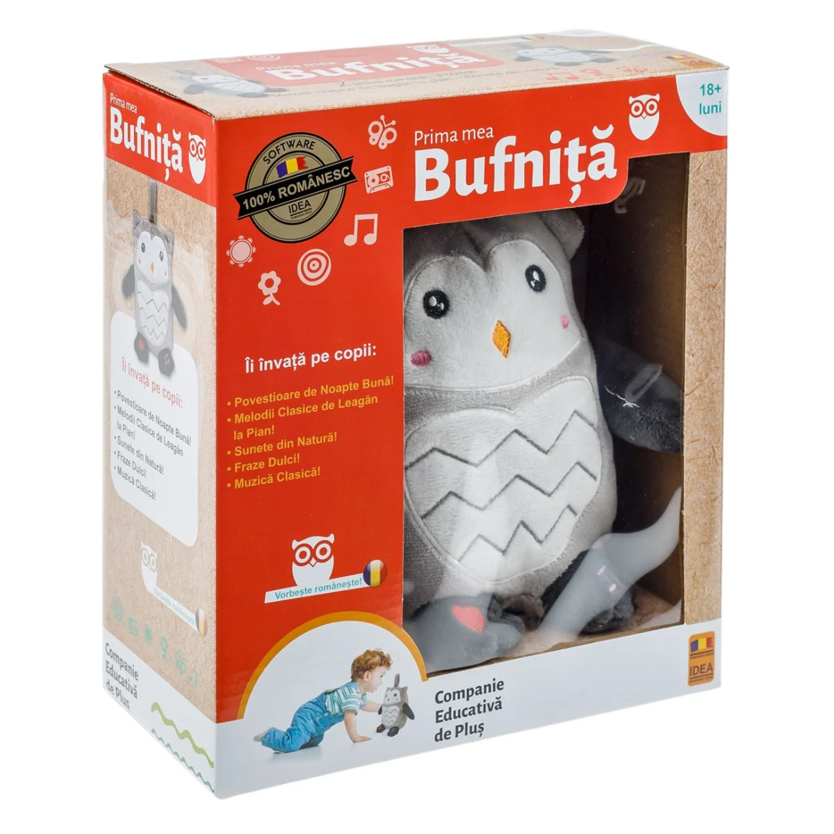 Prima mea Bufnita este o jucarie educativa adorabila si interactiva, conceputa pentru a oferi copiilor o experienta de invatare si relaxare. Acest companion moale si placut la atingere ii vorbeste copilului cu tandrete, oferind o varietate de sunete si melodii menite sa aduca zambete si sa linisteasca. Bufnita reda povesti de noapte buna, cantece de leagan, sunete din natura, fraze dulci si muzica clasica usoara, fiind astfel un tovaras ideal atat pentru dimineti vesele, cat si pentru nopti linistite.