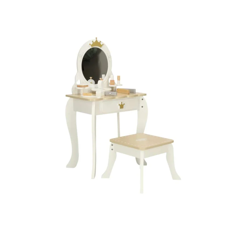 Transforma visul micutei tale in realitate cu aceasta masuta de toaleta pentru copii, perfecta pentru jocul de rol si dezvoltarea creativitatii! Aceasta masa de toaleta eleganta include un oglinda sigura pentru copii, un sertar pentru depozitare si un set complet de accesorii pentru ingrijire si infrumusetare.