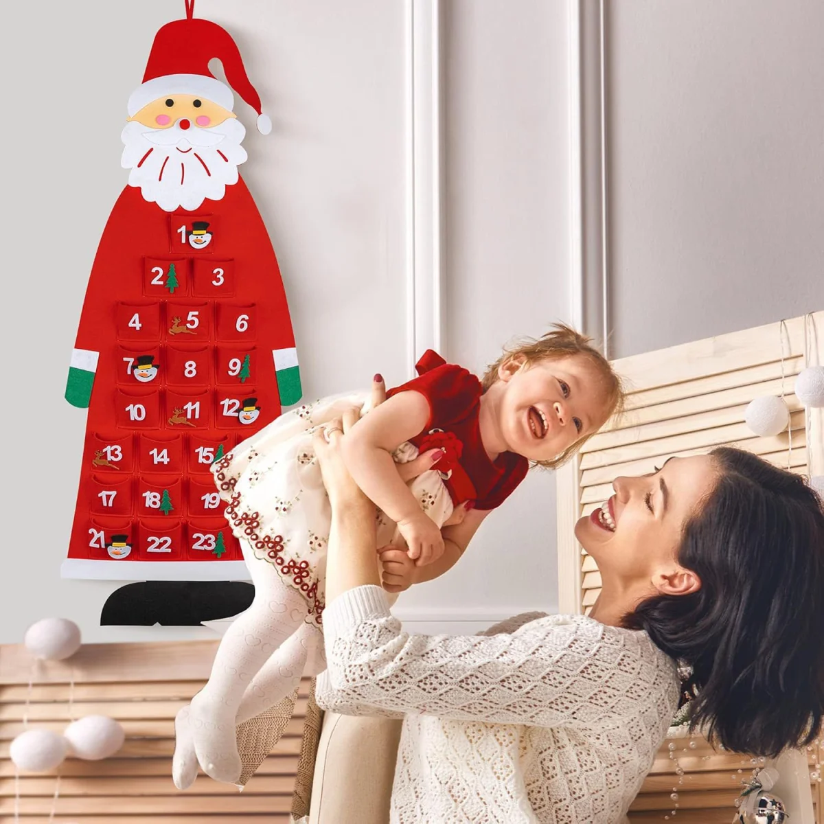 Fiecare zi este reprezentata de un buzunar individual, ideal pentru mici surprize sau decoratiuni. Materialul din pasla este rezistent si usor de utilizat, iar culorile vibrante il transforma intr-un accesoriu perfect pentru decorarea casei in perioada sarbatorilor.