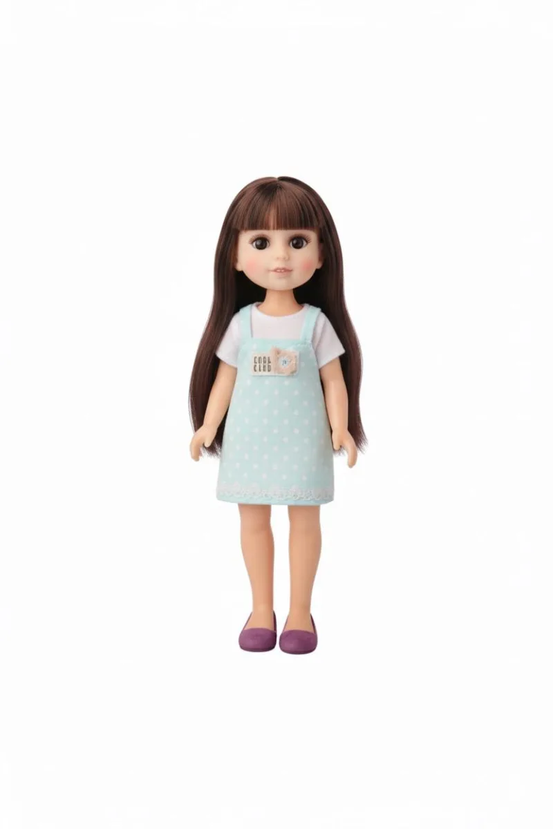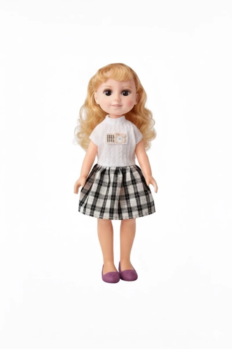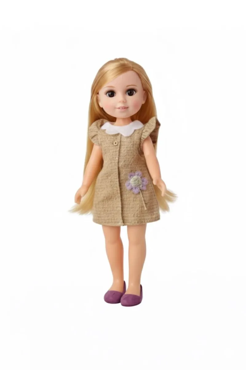 Cu o inaltime de 33 cm, papusa este perfecta pentru manutele copiilor, fiind usor de tinut, imbracat si transportat. Papusa poarta o rochita luminoasa cu bretele, in nuante pastel potrivite pentru universul inocent al celor mici. Parul lung si matasos, ochii mari si expresivi si zambetul discret transforma papusa intr-o prezenta calda si potrivita pentru joaca zilnica.