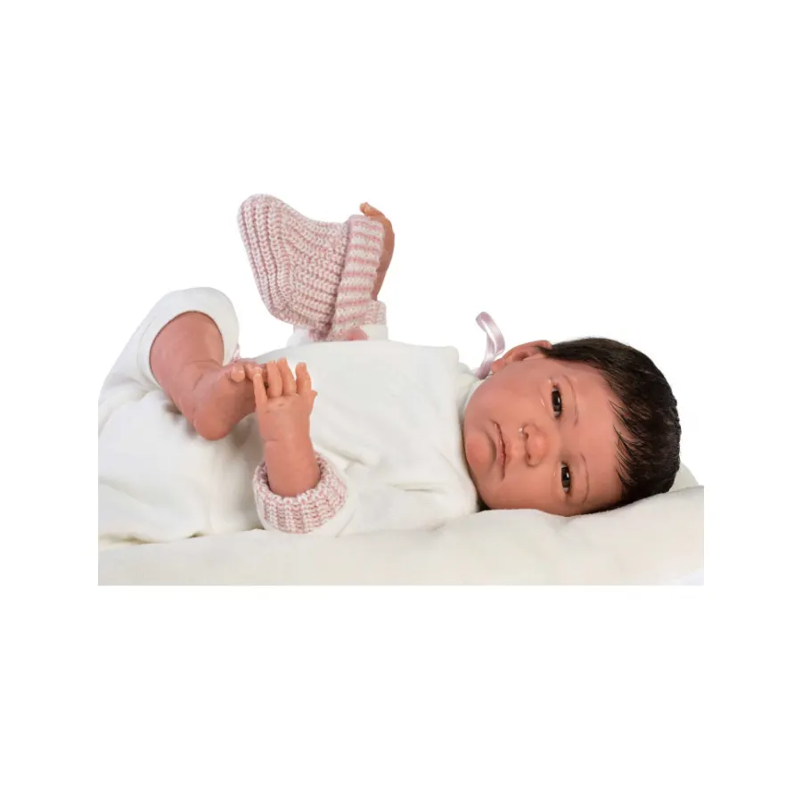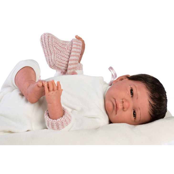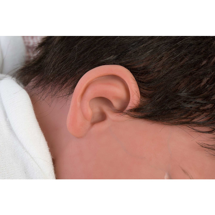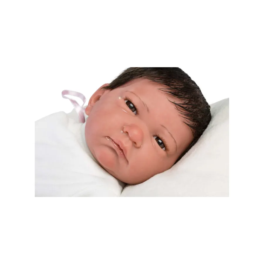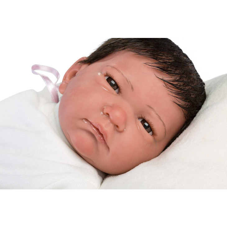Aceasta papusa de 42 cm este realizata din vinil moale, placut la atingere. Capul, manutele si piciorusele sunt pictate manual de artizani, cu atentie extrema la detalii: venisoare vizibile, nuante naturale ale pielii si expresia blanda, profunda a unui nou-nascut. Ochii acrilici caprui si fixi completeaza un ansamblu uimitor de realist.