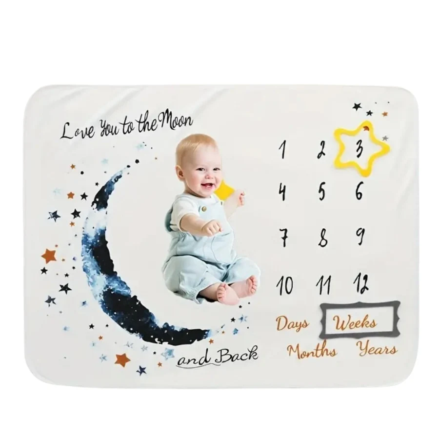 Paturica este decorata cu o semiluna si stelute colorate, insotite de mesajul "Love you to the Moon and back," care simbolizeaza dragostea infinita pentru micutul dumneavoastra. Acest design captivant este ideal pentru baieti, oferindu-le un cadru plin de magie si veselie in fiecare fotografie.