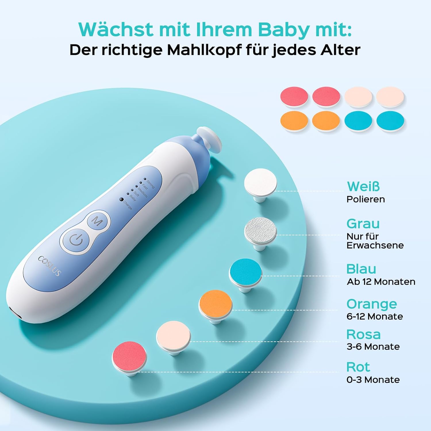 Pila este echipata cu 6 capete de pilire, concepute pentru a oferi flexibilitate si eficienta in utilizare. Aceste accesorii permit o ingrijire adaptata, in functie de etapa de dezvoltare a copilului. Astfel, produsul devine un ajutor practic pe termen lung si un accesoriu util in orice casa cu copii mici.