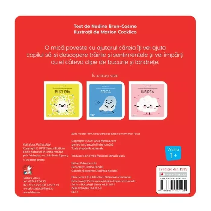 Prima mea carticica despre sentimente: Furia este o poveste delicata care il ajuta pe copil sa recunoasca si sa inteleaga furia ca parte naturala a trairilor sale. Prin situatii simple si personaje apropiate de lumea copiilor, micutul invata ca emotiile sunt normale si ca exista modalitati sanatoase de a le gestiona.