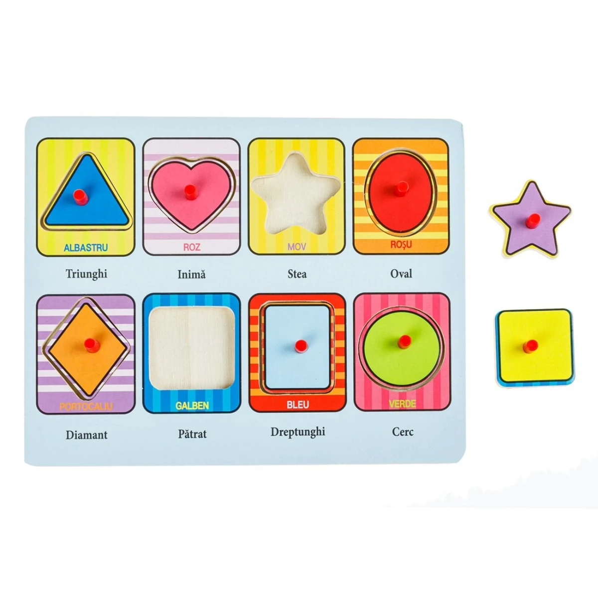 Acest puzzle din lemn este ideal pentru micutii care invata sa recunoasca formele, culorile si primele cuvinte. Puzzle-ul include 8 piese diferite, fiecare reprezentand o forma geometrica colorata, insotita de denumirea culorii si a formei. Fiecare piesa se potriveste intr-un spatiu dedicat pe tabla de lemn. Incurajand copiii sa invete prin joaca si sa isi dezvolte abilitati esentiale.