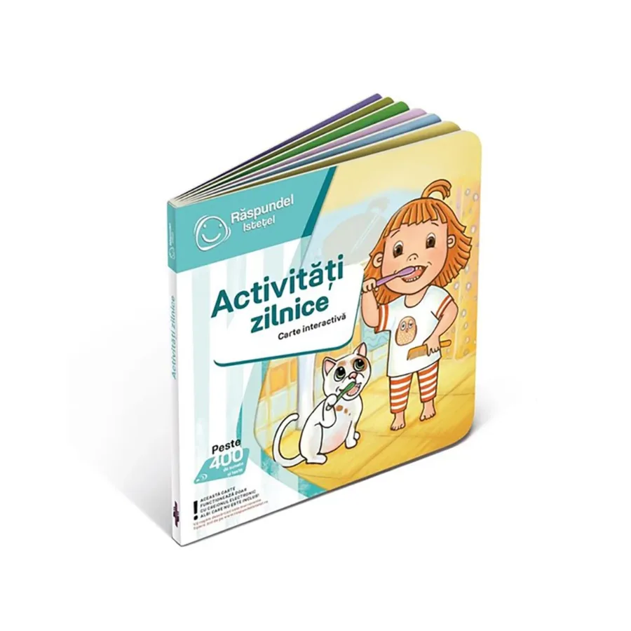 Carte educativa „Raspundel Istetel Activitati Zilnice” este partenerul ideal pentru micutii care doresc sa exploreze rutina zilnica intr-un mod interactiv si distractiv. Alaturi de Iulia, Ionut, catelul Max si pisica Mina, copiii vor invata pas cu pas activitatile zilnice, de la trezire si spalat pe dinti, pana la jocuri si cantece vesele. Fiecare pagina a cartii este plina de ilustratii atractive si sunete care vor capta atentia celor mici.