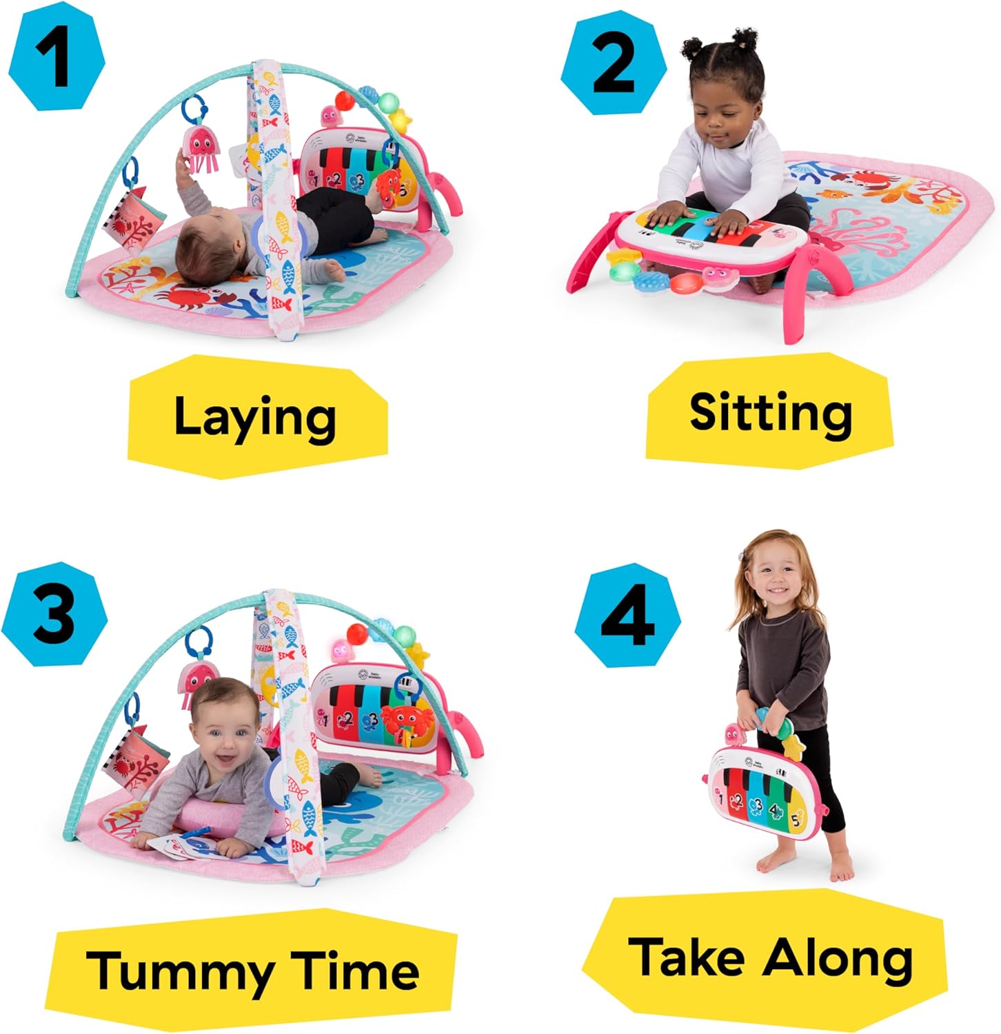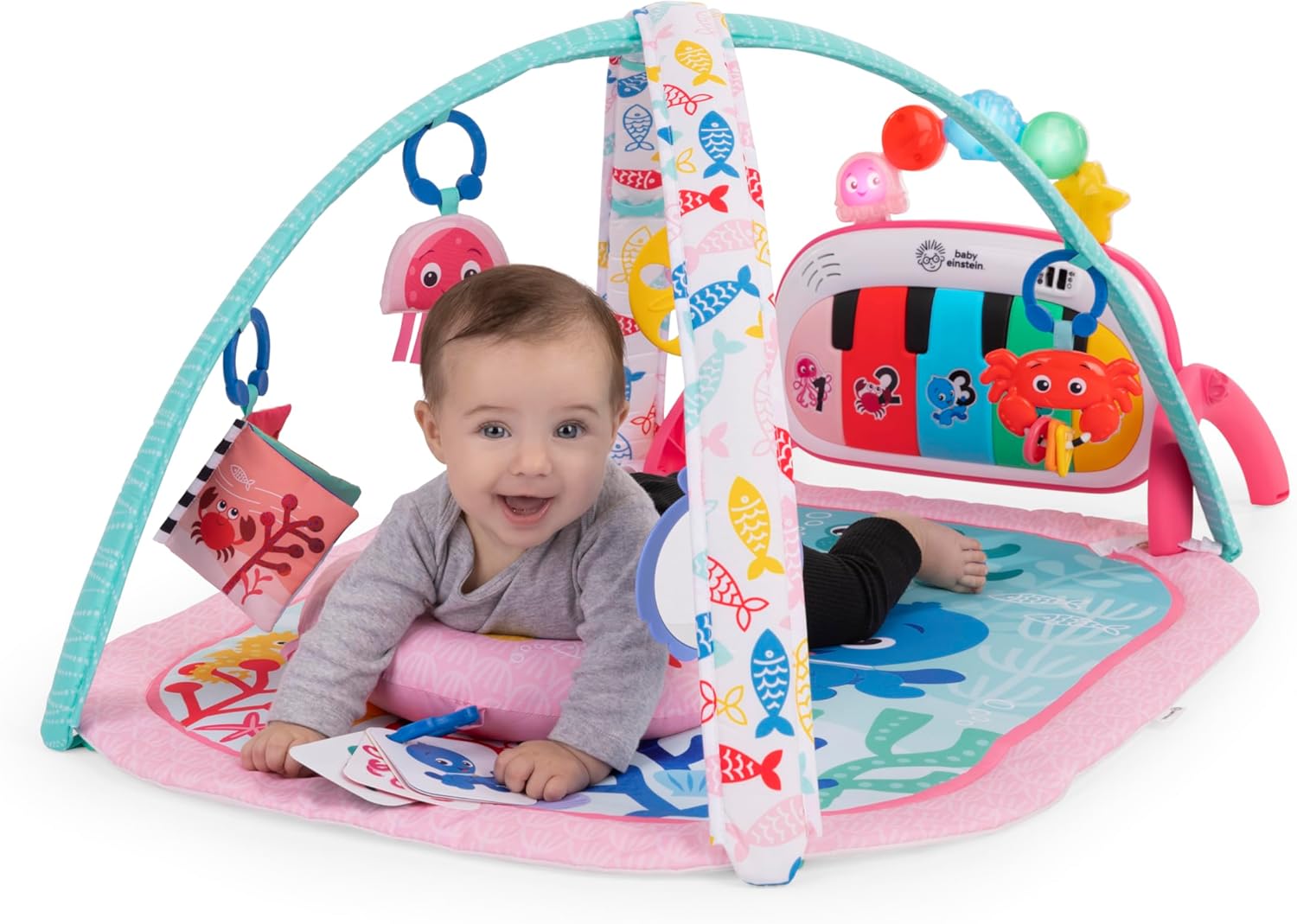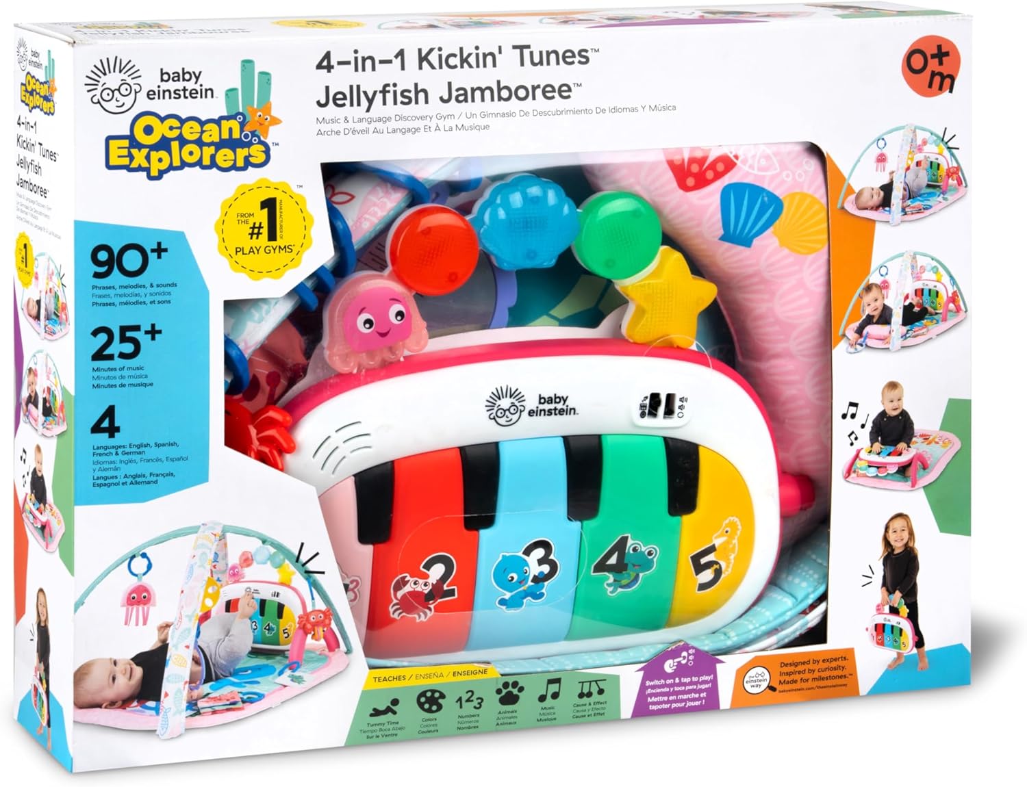 Salteluta muzicala pentru bebelusi 4 in 1 Kickin' Tunes, Baby Einstein, Jellyfish Jamboree, Roz este un centru de joaca interactiv creat pentru a sustine dezvoltarea armonioasa a bebelusului inca din primele luni de viata. Conceputa pentru copii de la 0 la 36 de luni, aceasta salteluta combina joaca, muzica, lumini si explorarea senzoriala intr-un mod distractiv si educativ.