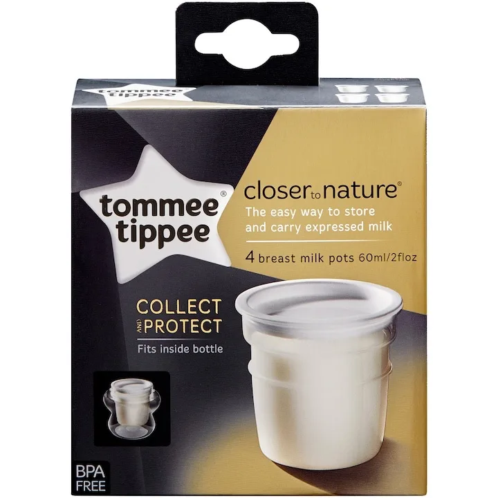 Set 4 buc Recipiente de stocare lapte matern Tommee Tippee sunt ideale pentru mamele care doresc sa colecteze si sa pastreze laptele matern in conditii sterile. Fiecare recipient are capacitatea de 60 ml si poate fi folosit direct cu pompele de san Closer to Nature. Astfel, laptele poate fi extras direct in recipient, fara risipa sau transfer inutil.