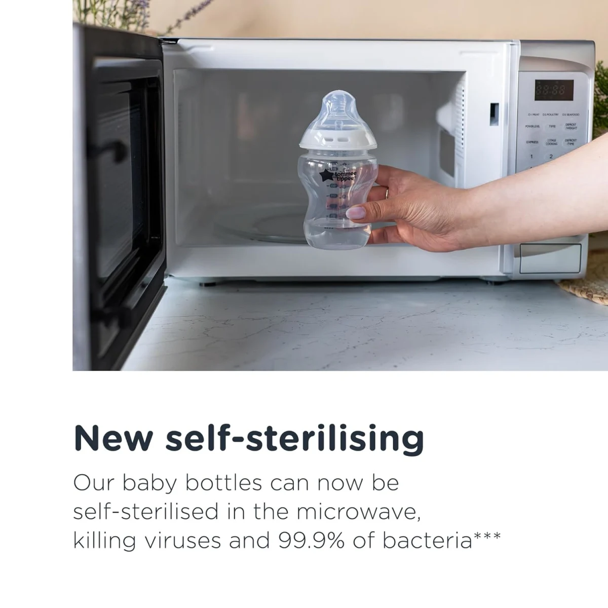 Biberoanele Tommee Tippee Natural Start sunt extrem de practice datorita functiei de autosterilizare. In doar 3 minute, acestea pot fi sterilizate direct in cuptorul cu microunde, fara a fi nevoie de un aparat suplimentar.