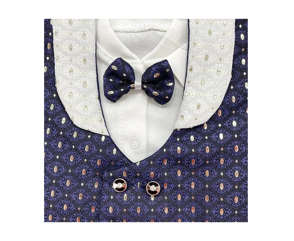 - Design elegant: Vesta bleumarin și papionul alb conferă un aspect rafinat și festiv, perfect pentru botez.