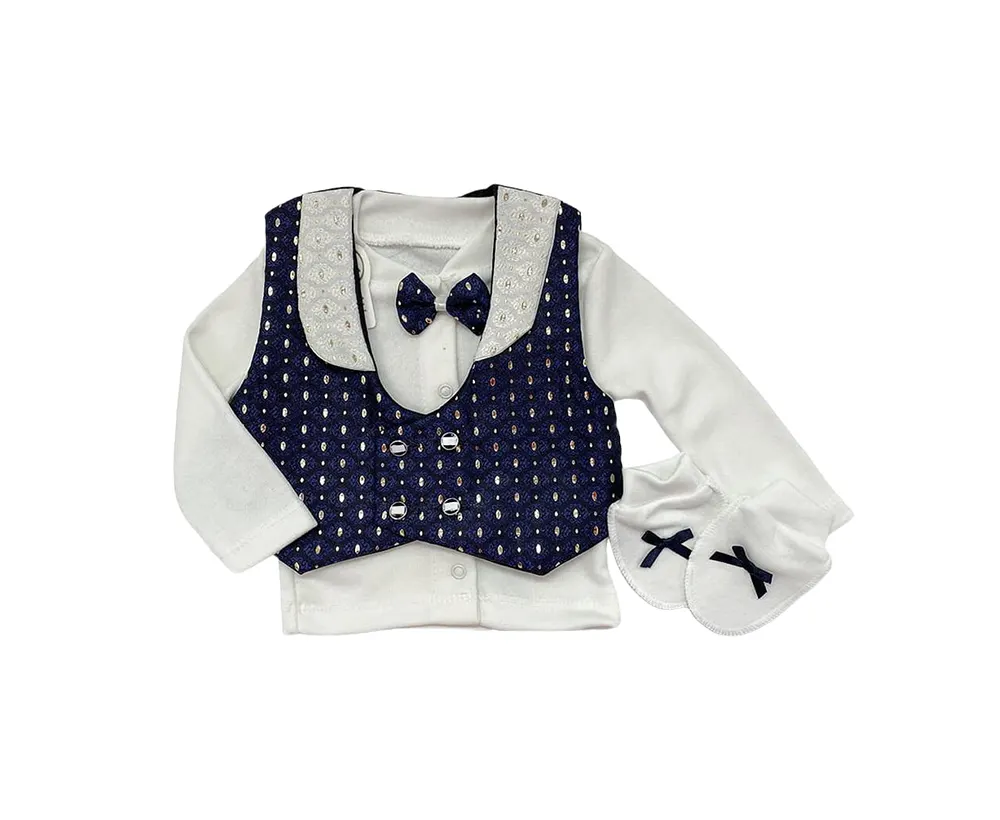 Acest set de botez pentru bebeluși băiat este perfect pentru o ocazie specială, un eveniment. Confortabil și elegant, setul este confecționat din materiale de înaltă calitate, oferind confort și siguranță pentru pielea delicată a bebelușului. Setul conține șapte piese esențiale: vestă bleumarin, bluză albă, botoșei albi, pantalonasi albi, căciuliță albă, mănuși albe și papion alb.