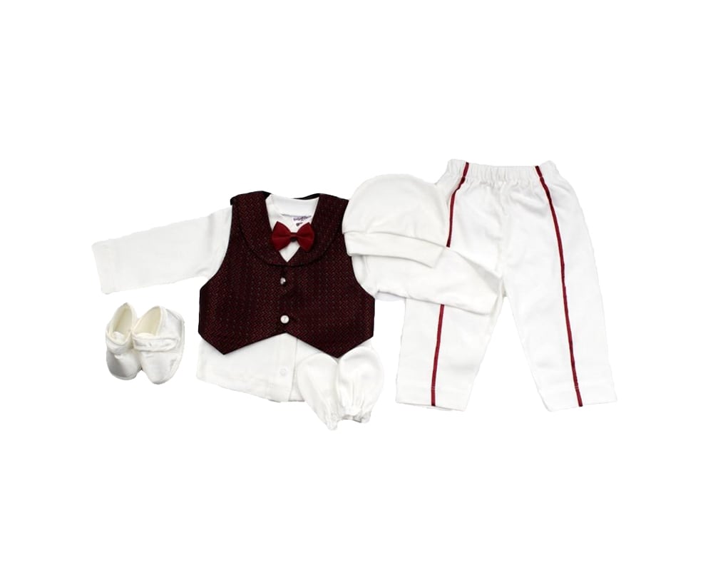 - Design elegant: Vesta burgundy și papionul alb conferă un aspect rafinat și festiv, perfect pentru botez. Dungile burgundy de pe pantaloni adaugă un plus de stil.