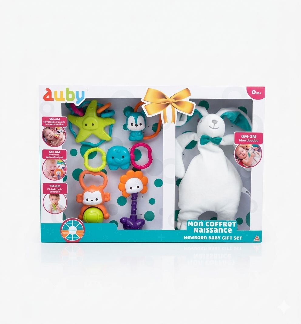 Set cadou Auby pentru nou-nascuti este alegerea ideala pentru parintii care vor sa ofere bebelusului o experienta completa de joaca, explorare si dezvoltare chiar din primele luni de viata. Conceput pentru 0+ luni, acest set reuneste jucarii senzoriale atent alese, menite sa stimuleze curiozitatea, simturile si primele miscari ale copilului.