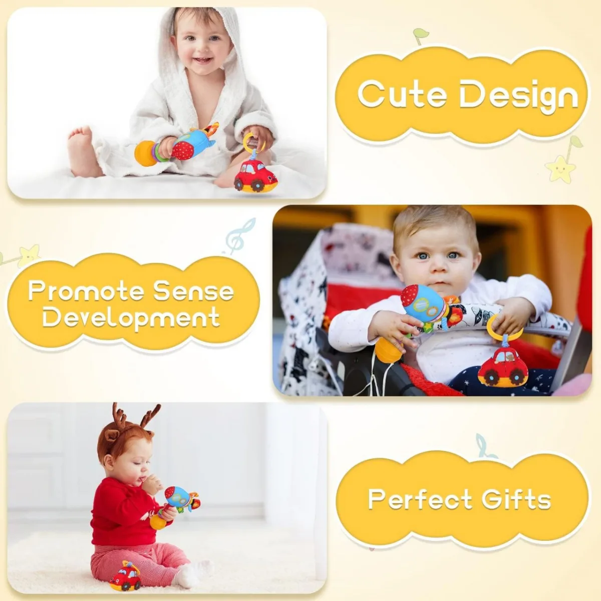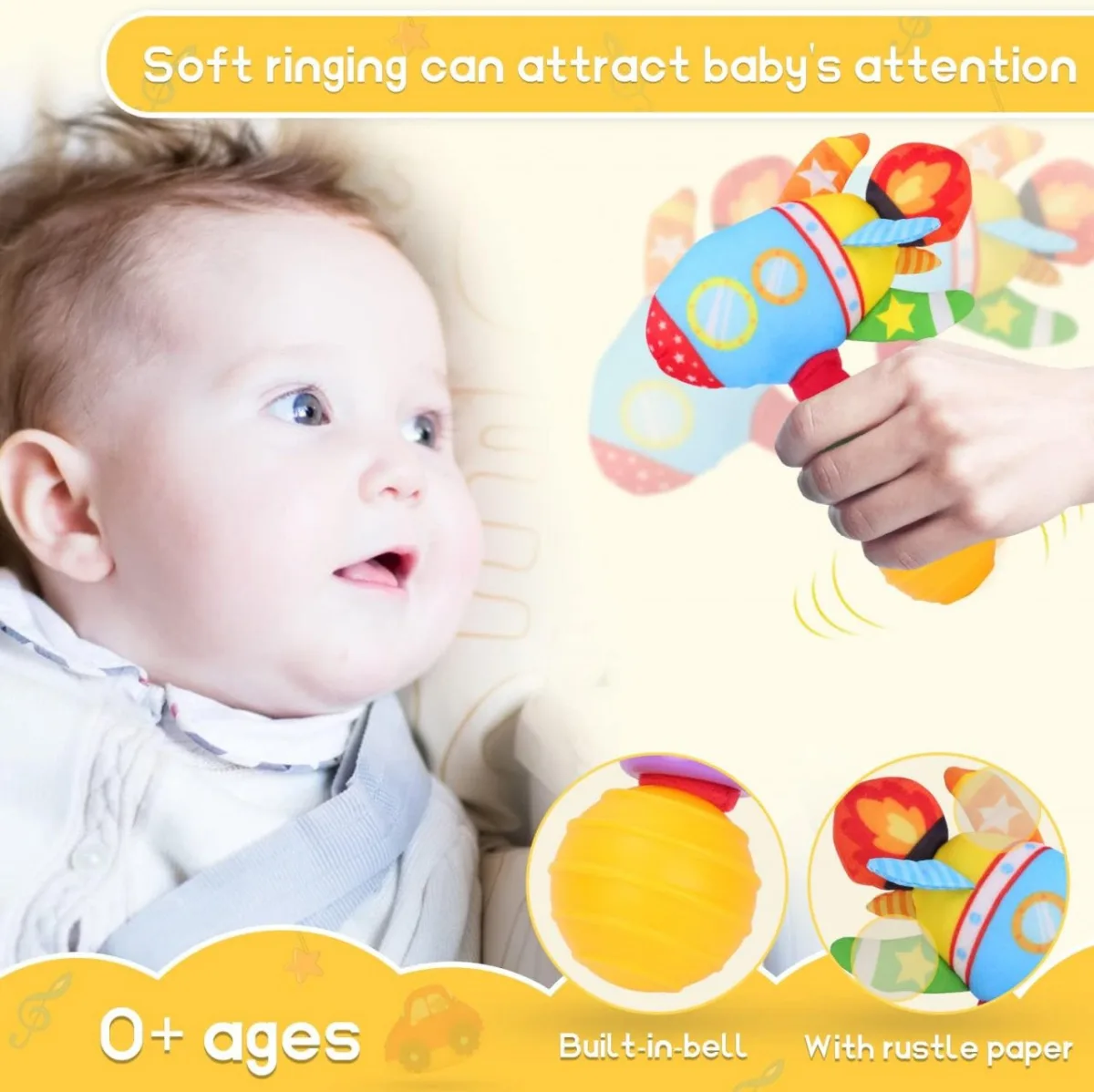 Zornaitoare de plus: produce un sunet moale atunci cand este agitata, stimuland simtul auditiv si incurajand explorarea.