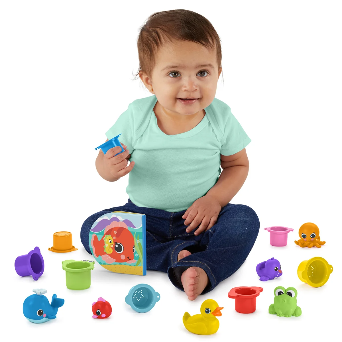 Set de baie pentru bebelusi Bright Starts Splash 15 piese include 15 jucarii: o clasica rață de cauciuc, cinci prieteni acvatici (broasca, peste, mors, balena si caracatita), o carte impermeabila si 8 cani colorate de stivuire. Este ideal pentru baita zilnica sau pentru joaca pe podea, oferind momente de distractie sigura si educativa.