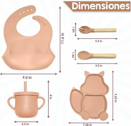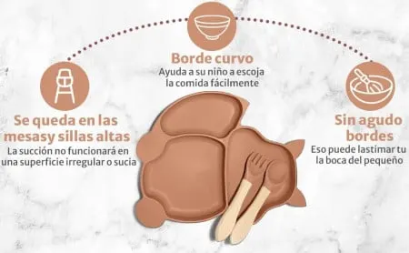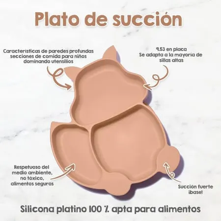 Farfuria este prevazuta cu o ventuza mare care o fixeaza de masa, prevenind alunecarea si varsarea alimentelor. Are forma de veverita simpatica.