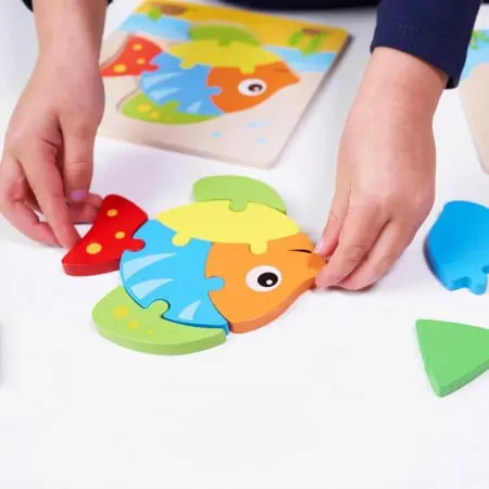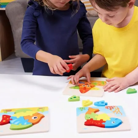 Setul contine 3 puzzle-uri din lemn reprezentand creaturi marine prietenoase: o stea de mare, un delfin si un pestisor. Fiecare piesa este usor de manevrat si adaptata pentru mainile mici ale copiilor. Culorile vii si piesele rezistente transforma fiecare activitate de joaca intr-o experienta educativa.