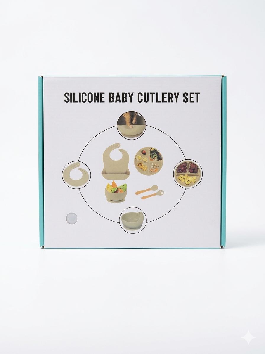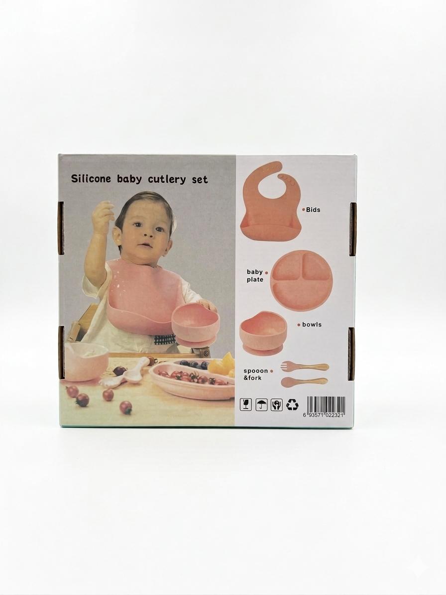 Set complet de hranire pentru bebelusi, cu 8 piese din silicon alimentar: baveta, farfurie, bol cu ventuza, tacamuri si cana pentru gustari. Ideal pentru diversificare.