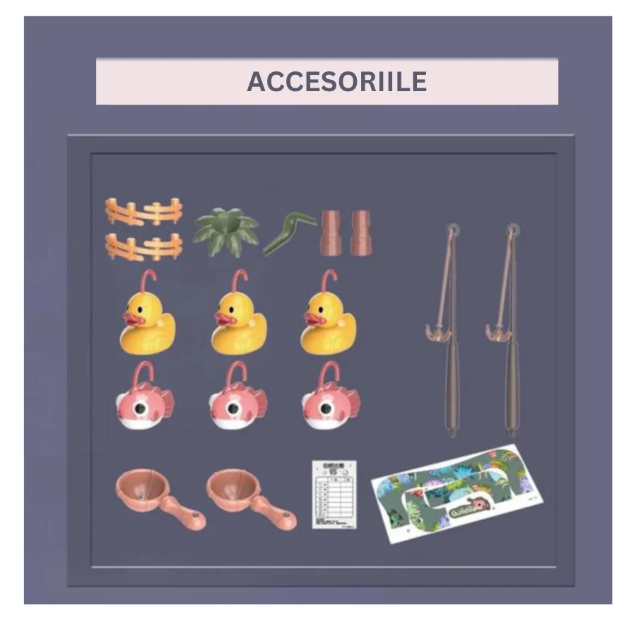 Pe langa functia de baza de pescuit, setul include o lingura cu gauri pentru a face jocul mai usor si o alta lingura cu care copiii pot crea o cascada distractiva. In plus, pentru a face experienta si mai captivanta, jucaria ofera optiunea de a alege intre 6 tonuri de apel diferite.
