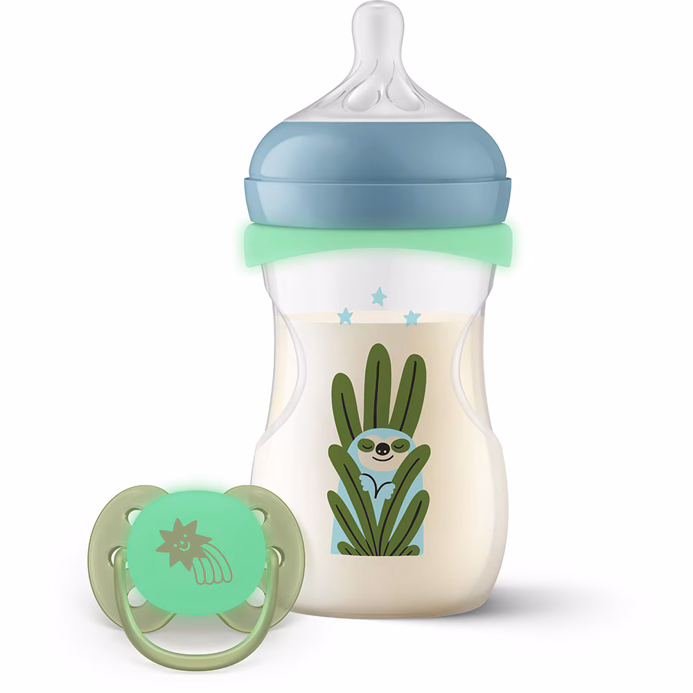 Un detaliu util al acestui set este accesoriul inel care lumineaza in intuneric. Acesta se incarca de la lumina ambientala sau de la lumina zilei si ofera o stralucire discreta, utila pentru hranirea pe timp de noapte. Parintele poate gasi mai usor biberonul sau accesoriile fara a perturba linistea bebelusului.