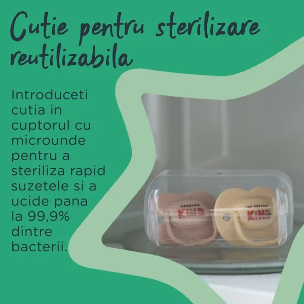 Fabricata din silicon 100% de calitate medicala, fara BPA, suzeta este moale, flexibila si durabila. Suprafata neteda nu retine pete sau mirosuri si este foarte simplu de curatat. Se poate steriliza rapid, inclusiv in cutia reutilizabila pentru sterilizare la microunde, eliminand pana la 99,9% dintre bacterii.