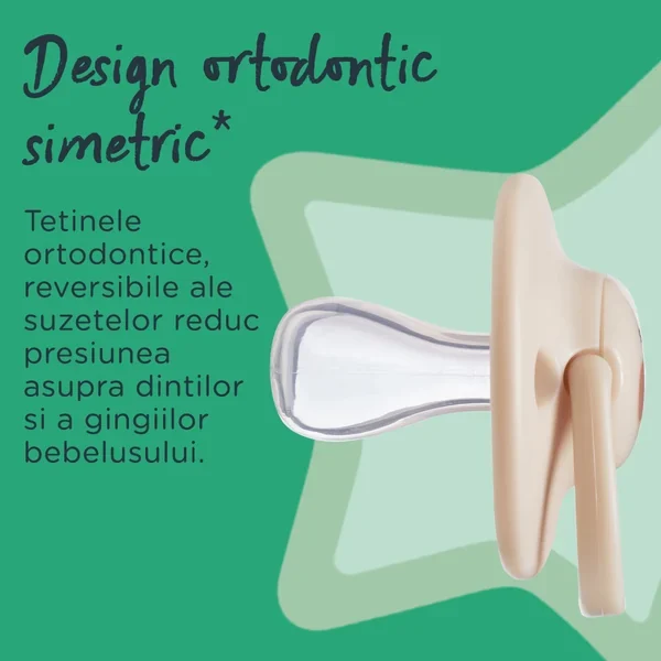 Tetina ortodontica, ovala si ventilata, se comprima usor, reducand presiunea asupra dintilor si gingiilor aflate in dezvoltare. Aceasta este realizata din silicon moale, complet reversibila si sigura pentru copil. Forma simetrica elimina posibilitatea de a o introduce gresit, contribuind astfel la confortul bebelusului si la o dezvoltare orala corecta.