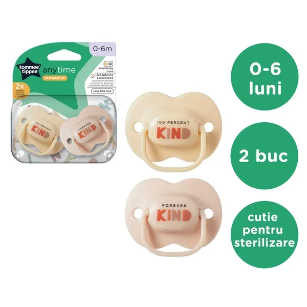 Suzeta ortodontica pentru 0-6 luni Anytime Bej de la Tommee Tippee sprijina dezvoltarea orala naturala si ofera confort bebelusului. Forma ortodontica si simetrica este usor acceptata, asigurand o pozitionare corecta si o calmare rapida a micutului.