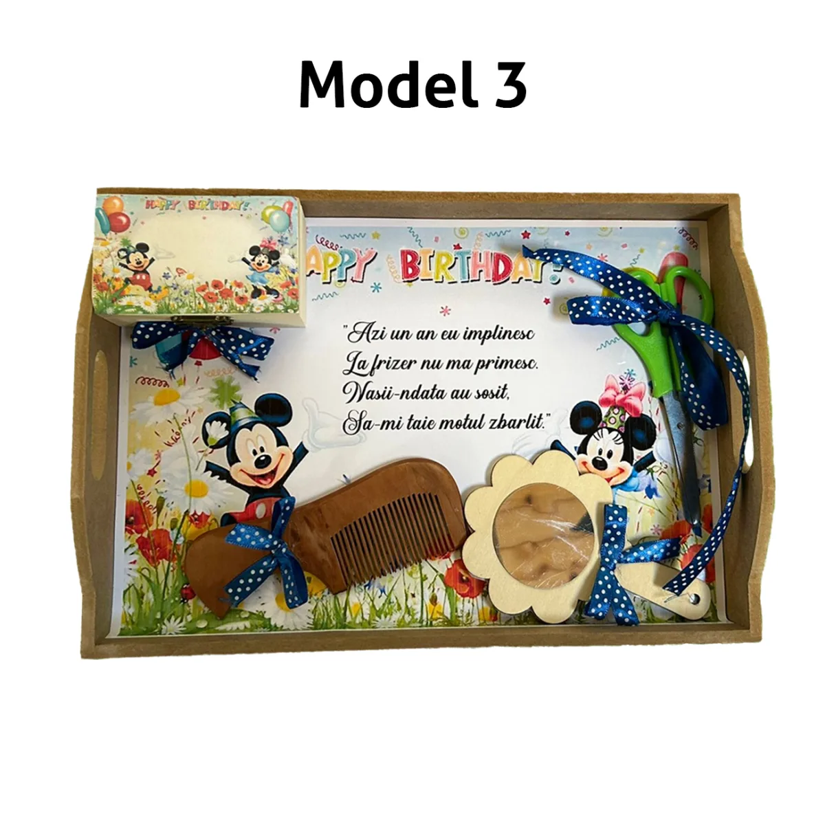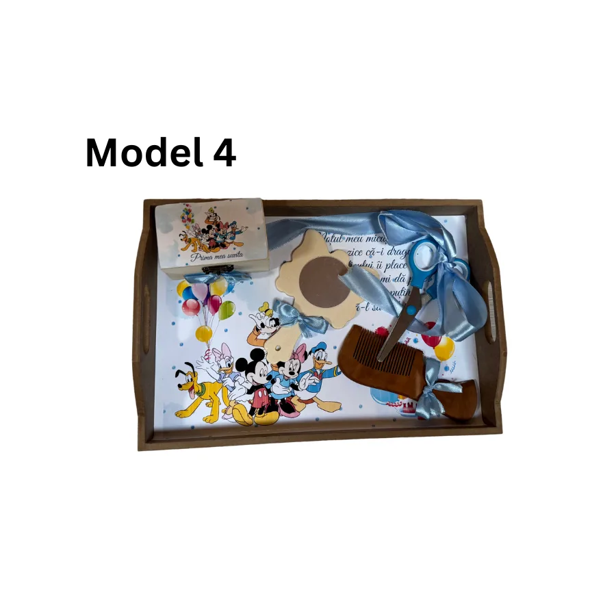* Culorile accesoriilor mici pot varia, va rugam sa ne lasati in detaliile de comanda daca doriti o anumita culoare. Tavita mot la bebelusi - Un set complet pentru un moment special Aceasta tavita pentru taierea motului la bebelusi este un produs special creat pentru a face din acest eveniment un moment cu adevarat memorabil. Cu un design atractiv si un mesaj de urare personalizat. Tavita mot aduce un plus de farmec si semnificatie traditiei de taiere a motului. Setul contine 5 piese esentiale, fiecare avand un rol bine definit in cadrul ceremoniei.