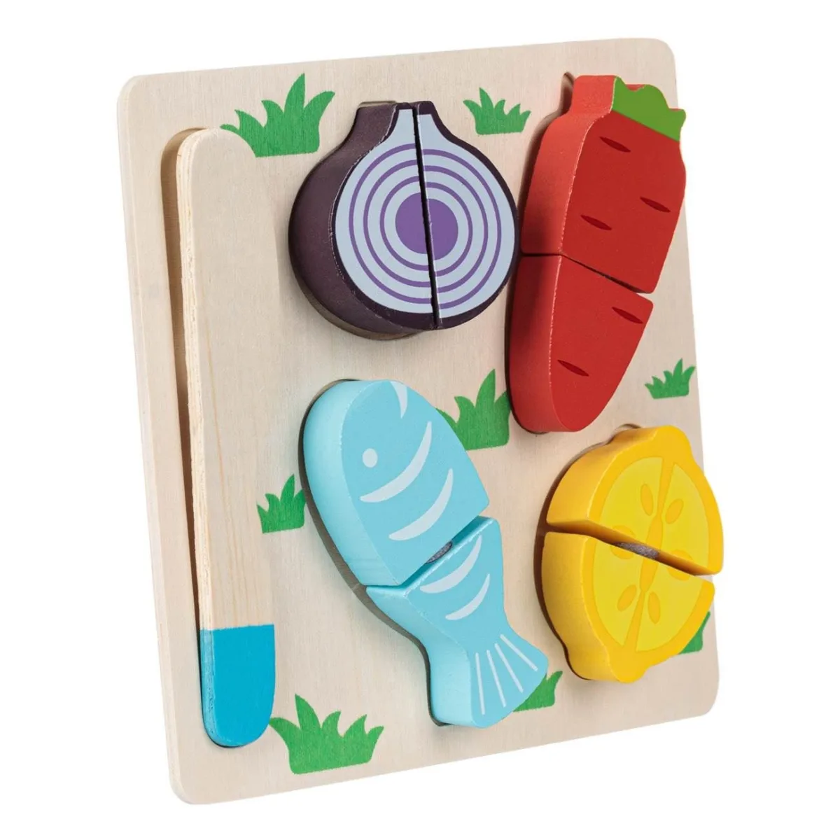 Setul contine 5 piese din lemn de calitate. Include legume colorate – morcov, ceapa, lamaie – si un peste, toate cu un design realist. Fiecare piesa este prevazuta cu banda adeziva cu scai, permitand copilului sa „taie” ingredientele in mod repetat. In plus, cutitul din lemn este sigur si usor de folosit de catre copii.