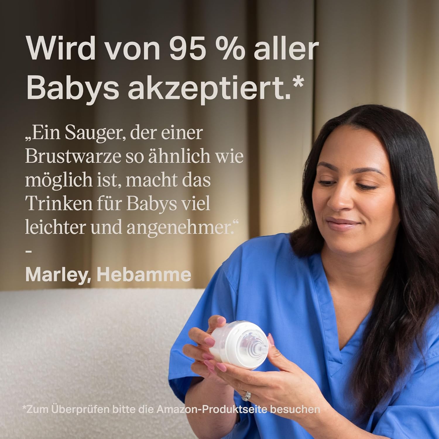 Tetina din silicon este modelata dupa forma naturala a sanului mamei. Aceasta ajuta la o atasare corecta si reduce riscul de confuzie intre san si biberon. Fiecare biberon este echipat cu tetina cu flux lent, potrivita pentru nou-nascuti si bebelusi mici.