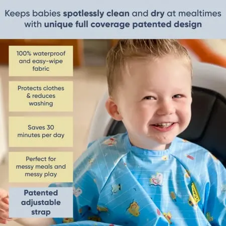 Conceput special pentru a oferi o acoperire maxima, tricoul protejeaza hainele de murdarie, fie ca este vorba de mancare, suc sau alte lichide. Poate fi folosit acasa, in scaunul de masa, in carucior sau chiar in calatorii. Se potriveste perfect cu tavitele scaunelor inalte si este compatibil cu majoritatea tipurilor de mese.