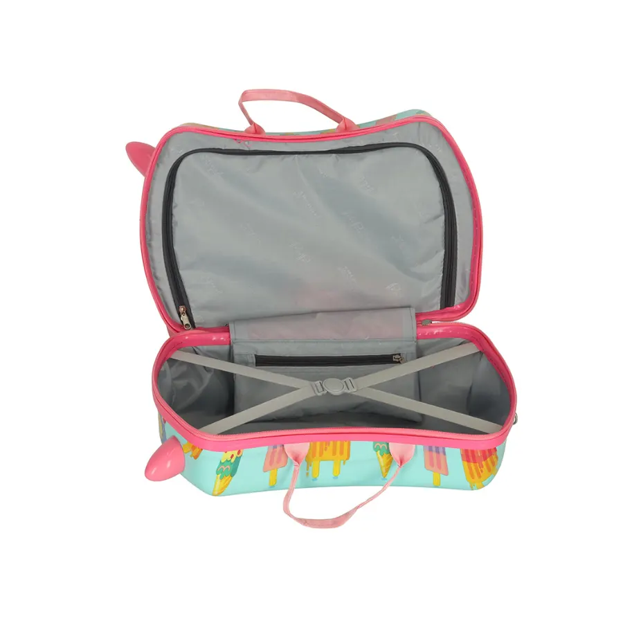 Troller cu roti pentru copii, decorat cu un imprimeu vesel cu inghetata, transforma orice calatorie intr-o experienta plina de culoare si bucurie. Creat special pentru cei mici, acest troller combina utilitatea unei genti incapatoare cu distractia unei jucarii pe roti. Datorita formei ergonomice si a detaliilor simpatice (cum ar fi "urechiusele" din fata), copilul tau il va indragi imediat.