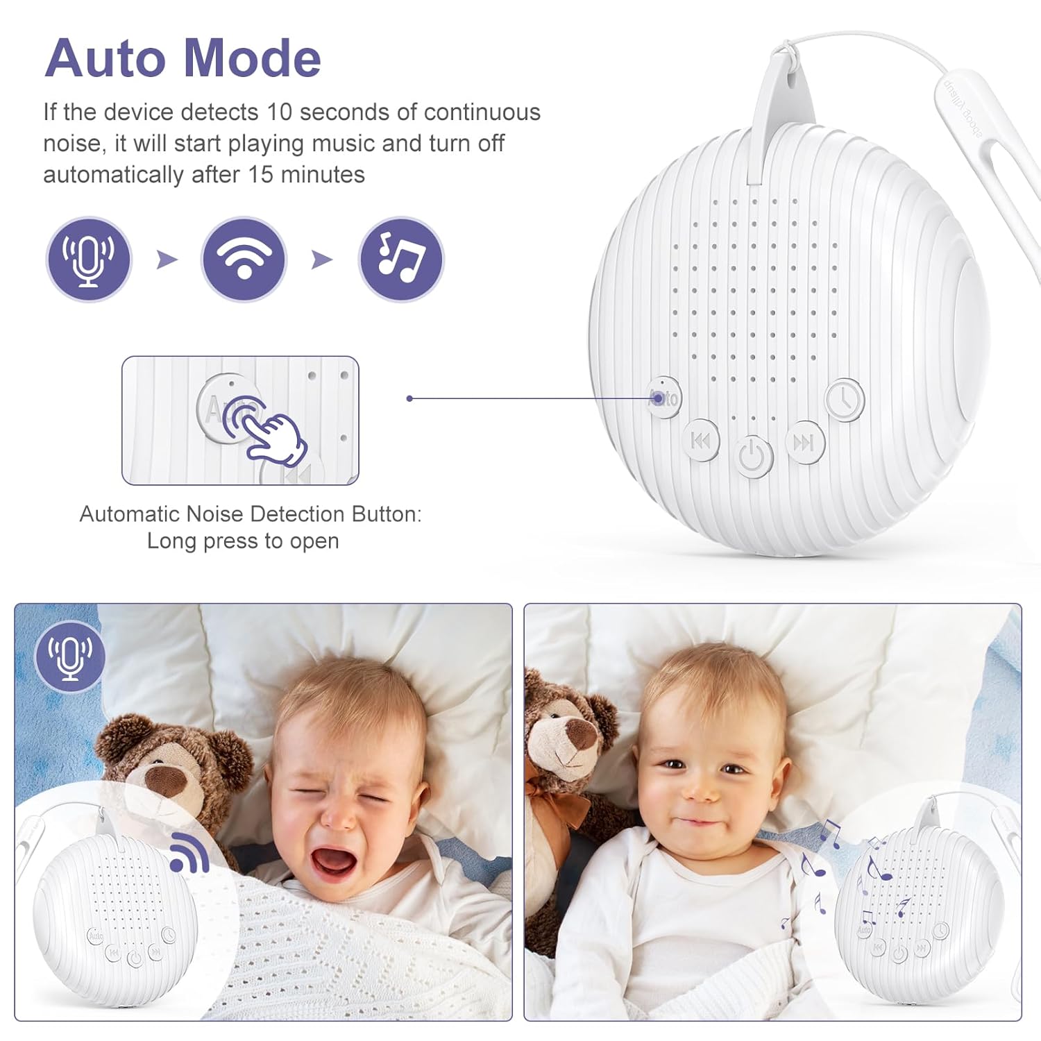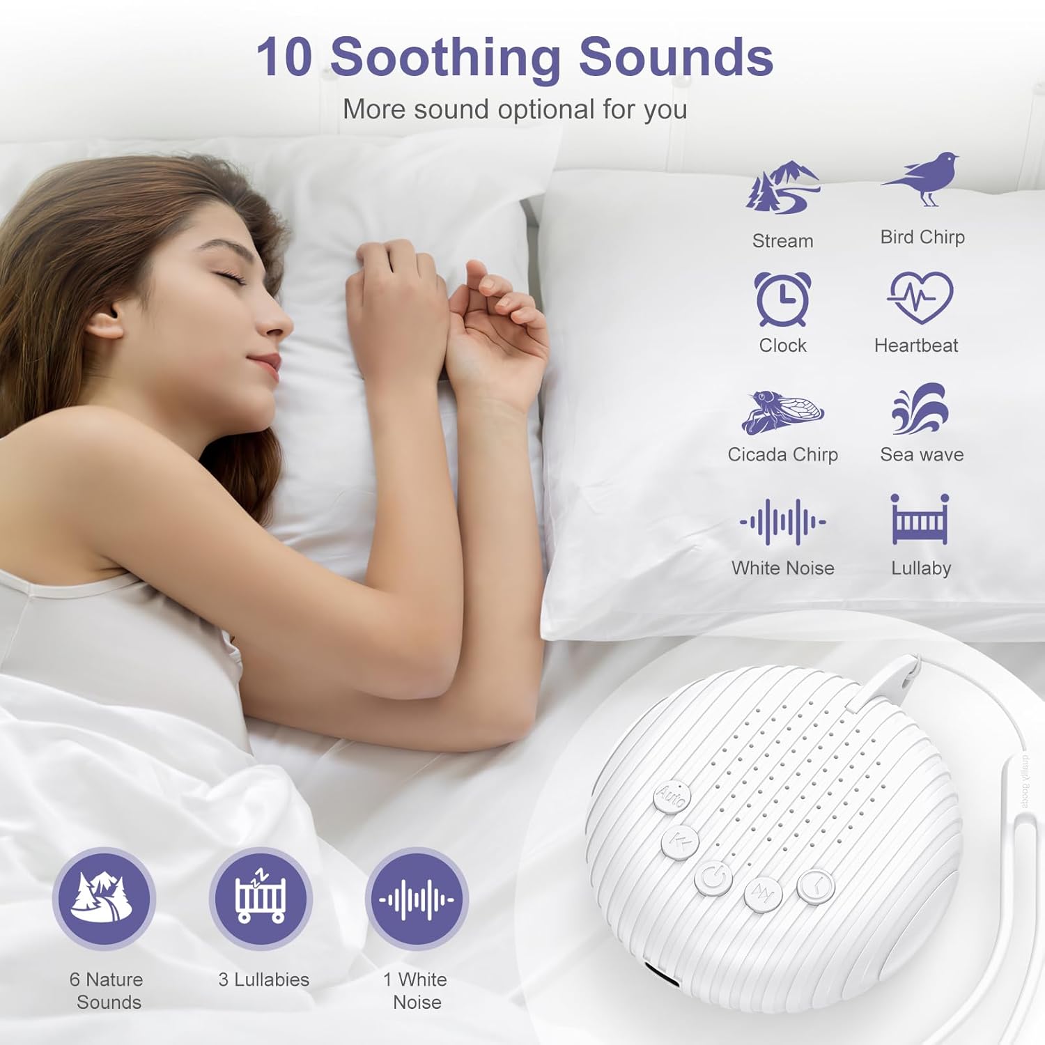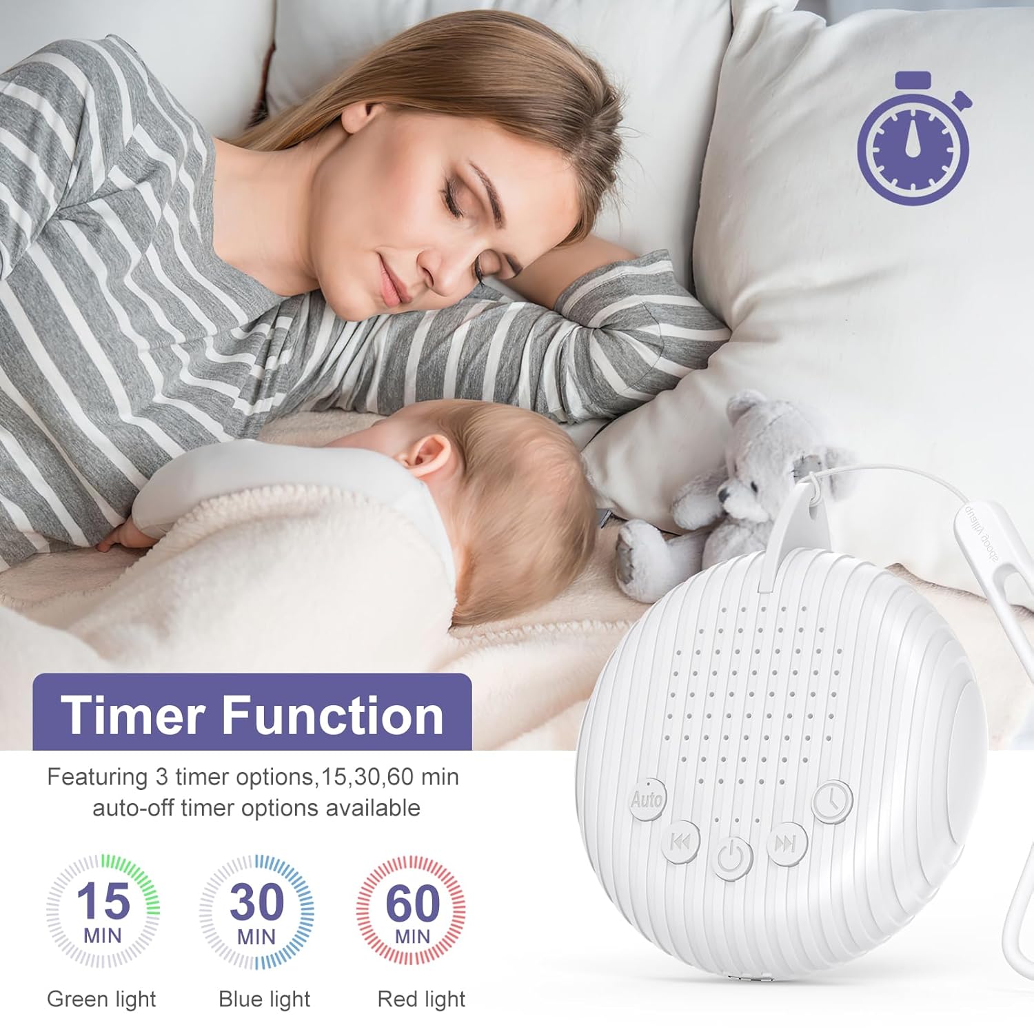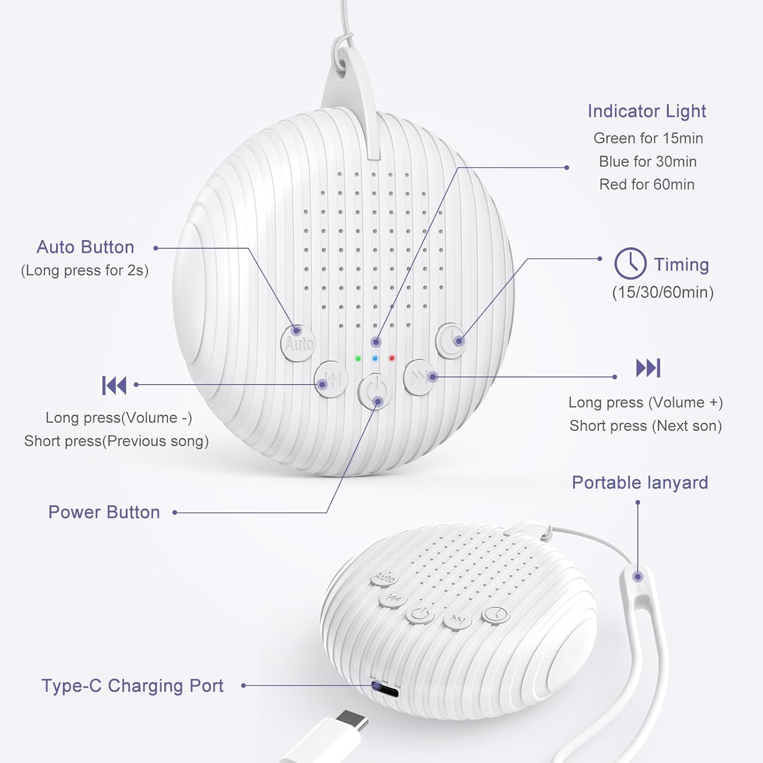 Aparat de sunete albe pentru somn, portabil si usor de utilizat, cu 10 sunete linistitoare, timer, functie de memorie si detectare automata a plansului. Reincarcabil USB, ideal pentru bebelusi, copii si adulti, perfect pentru acasa, masina sau calatorii.