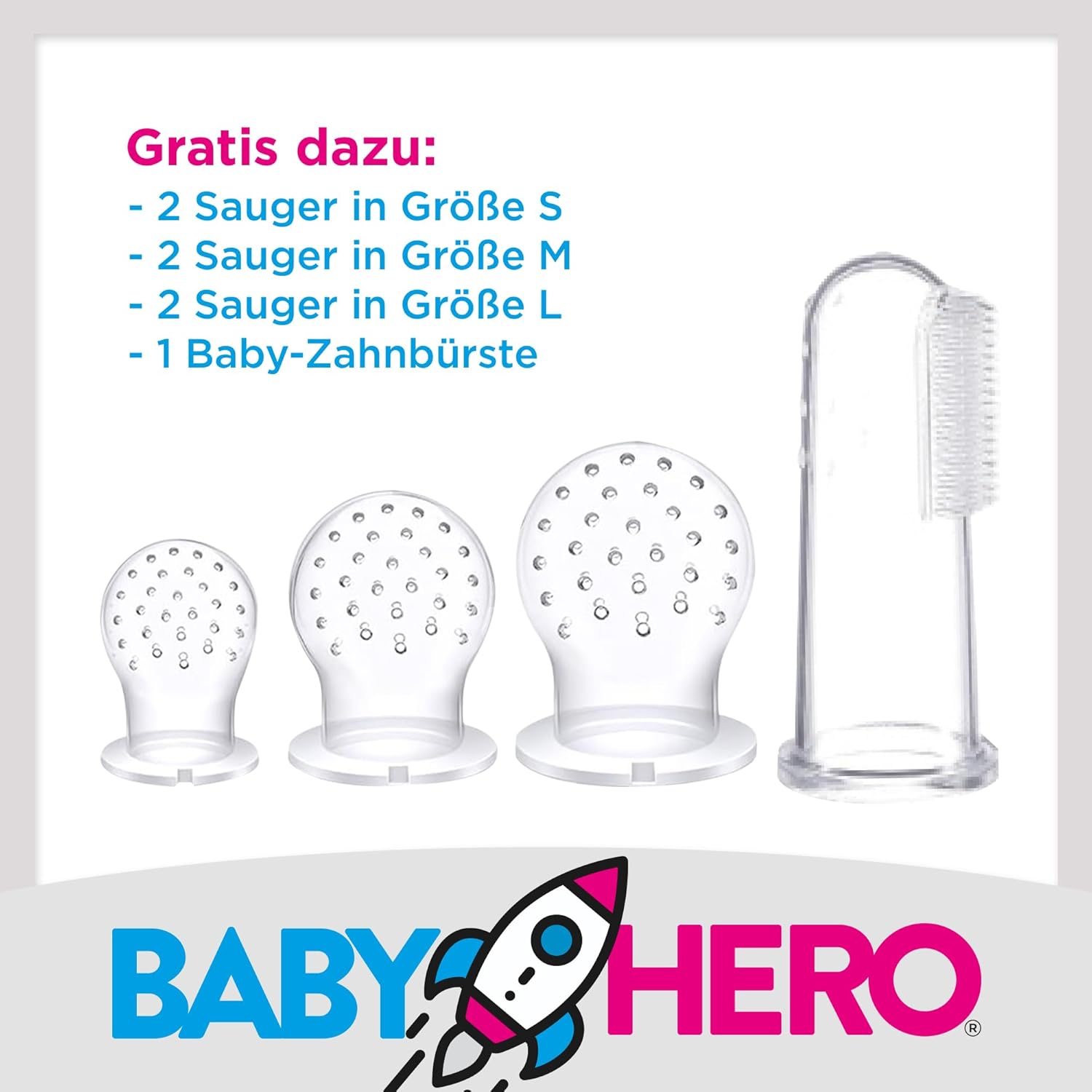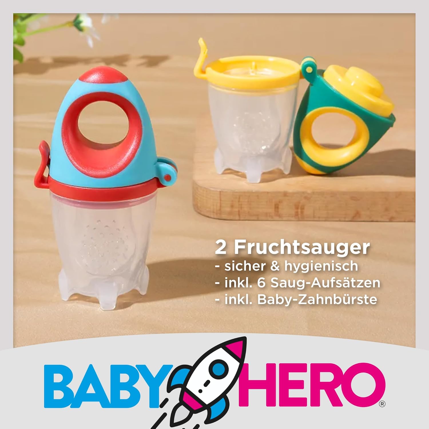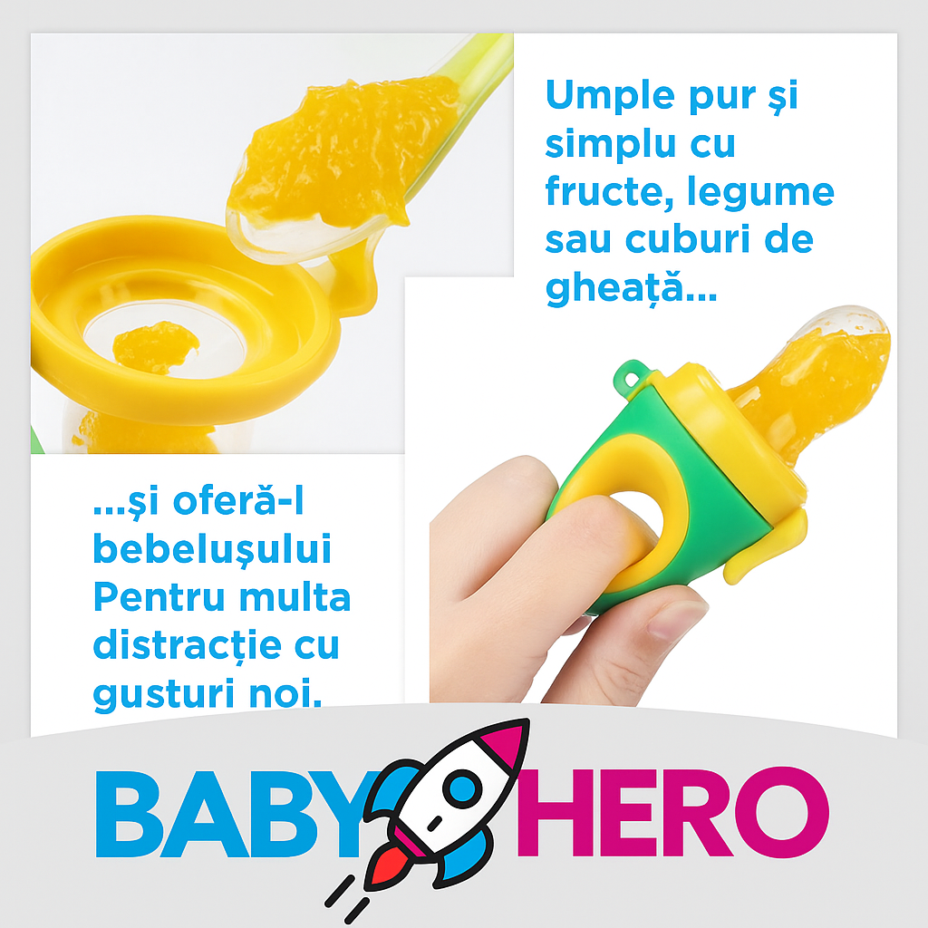 Baby Hero – Set 2 Fruit Feeder + 6 Tetine Silicon este creat pentru ca cei mici sa descopere gustul fructelor, legumelor si al piureurilor intr-un mod sigur si distractiv. Pachetul include 2 fruit dummy-uri in design modern tip racheta, 6 tetine din silicon alimentar in 3 marimi si o periuta pentru bebelusi – tot ce ai nevoie pentru o diversificare fara griji.