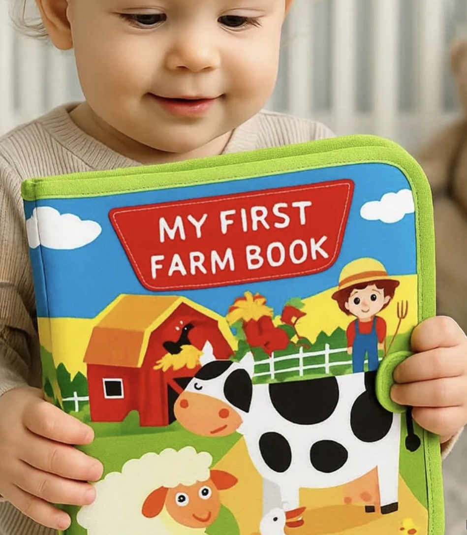 "My First Farm Book" prezinta elemente tematice inspirate din viata la ferma: animalute, legume, culori si obiecte familiare. Fiecare pagina include componente care se misca, se deschid, se scot sau se ataseaza, incurajand curiozitatea naturala a copilului.