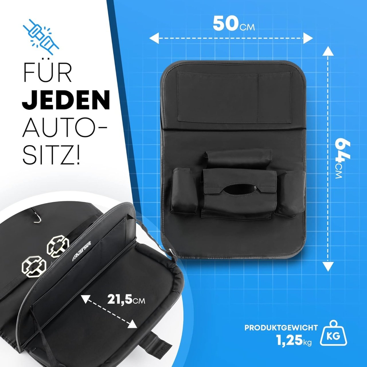 Organizatorul este realizat din piele PU de calitate, usor de curatat si durabila. Culoarea neagra se potriveste perfect cu interiorul oricarei masini, oferind un aspect elegant si profesional. Dimensiunile de 50 x 64 cm sunt ideale pentru a acoperi eficient spatarul scaunului, fara a incurca pasagerii.