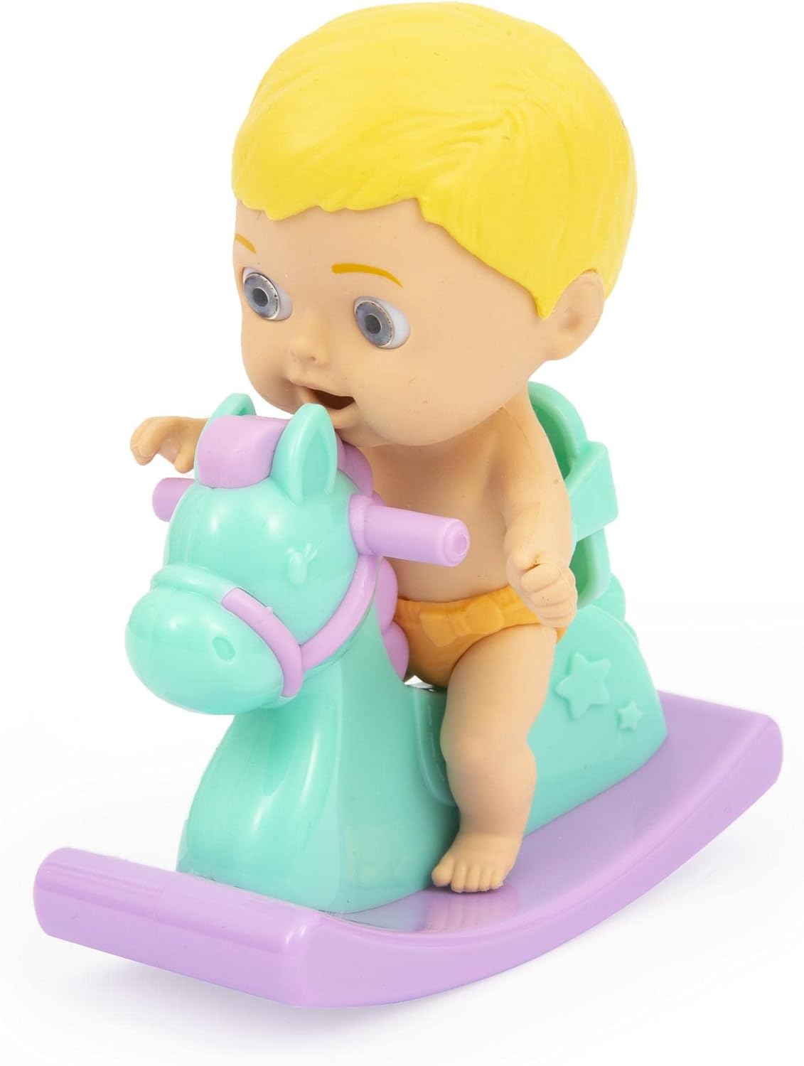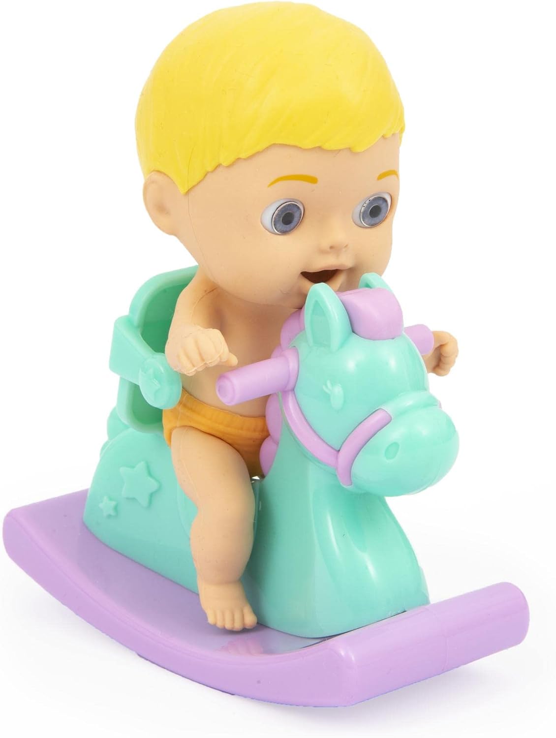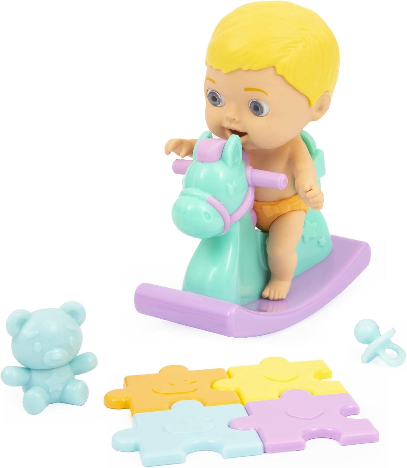 Papusa Cicciobello Amicicci cu calut balansoar si accesorii, Baietel blond.