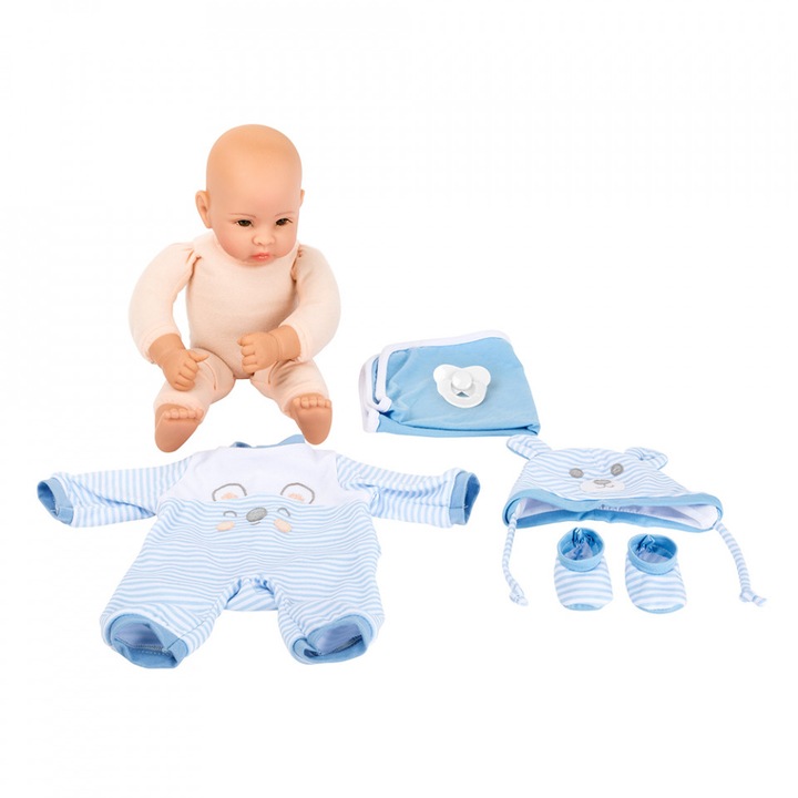 Cu ochi luminosi, hainute usor de imbracat, baveta cu Velcro, sapca, suzeta si o paturica moale de 27x27 cm, papusa este ideala pentru copiii 24+ luni.