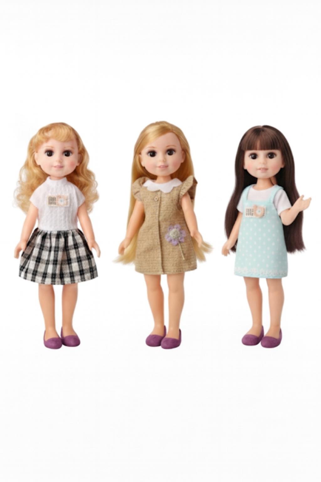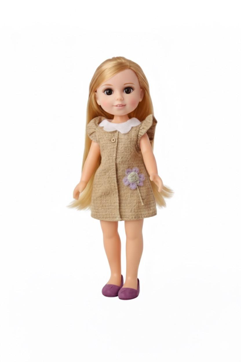 Cu o inaltime de 33 cm, papusa este perfecta pentru manutele copiilor, fiind usor de tinut, imbracat si transportat. Papusa poarta o rochita luminoasa cu bretele, in nuante pastel potrivite pentru universul inocent al celor mici. Parul lung si matasos, ochii mari si expresivi si zambetul discret transforma papusa intr-o prezenta calda si potrivita pentru joaca zilnica.